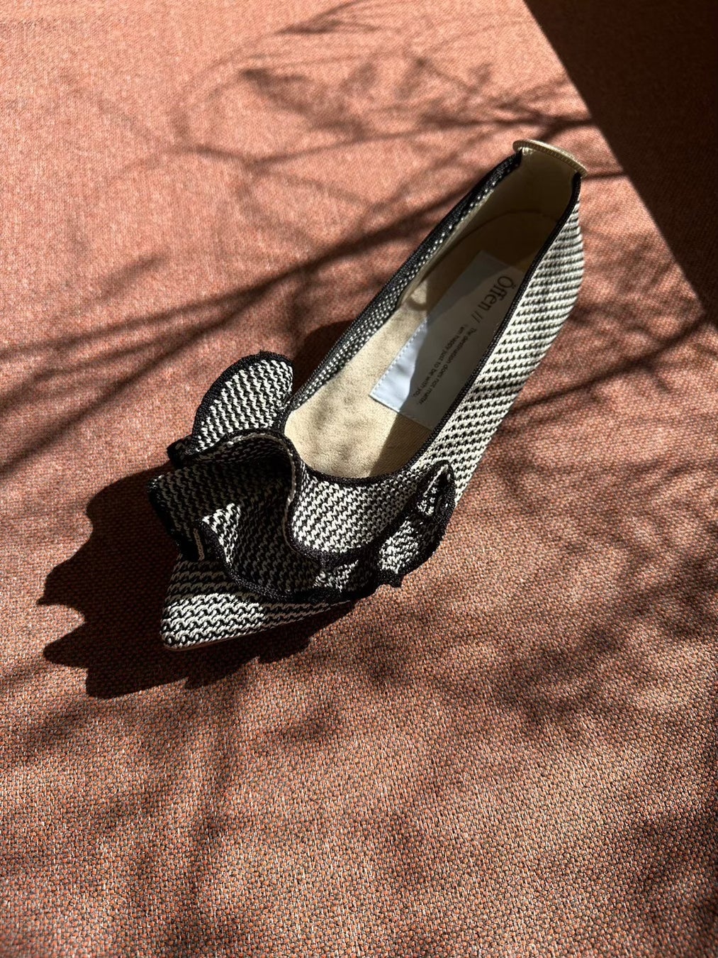 ベーシックなポインテッドトゥにデコラティブなビッグフリルを品よくあしらって。