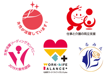 登録・認可: 多様な働き方ができる企業として、2017年に厚生労働省の「えるぼし」認定を獲得。この他にも、地方自治体が制定する、女性が活躍する企業に与えられる認証も複数受けています。働きやすい会社、仕事と介護、子育てが両立できる会社として多くの認証をいただいております。