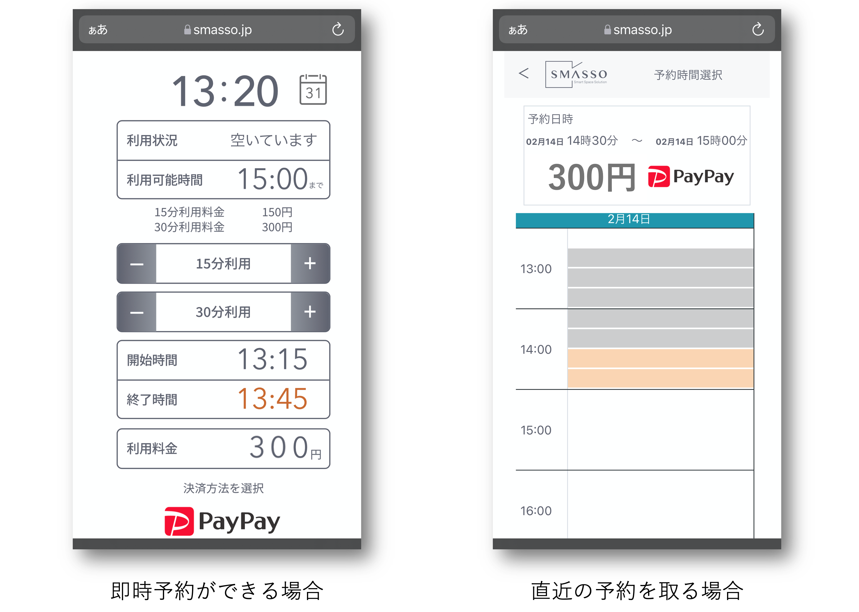 QRコードを読み込むだけで、対象シェアスペースが空室の場合は何時まで利用可能か表示され、利用したい時間を15分単位で指定すると、決済方法を選ぶだけで即時利用が可能となります。