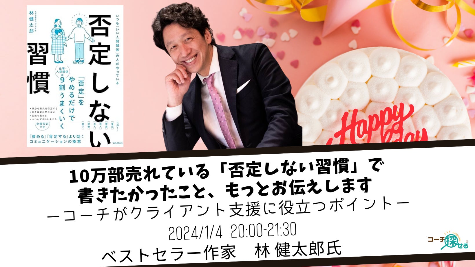 「コーチを探せる」は1月4日、ビジネスコーチ、ベストセラー作家の林健太郎さんを迎えて「10万部売れている「否定しない習慣」で書きたかったこと、もっとお伝えします ~コーチがクライアント支援に役立つポイント~」をテーマにオンラインでのトークライブ開催レポートを発表します。