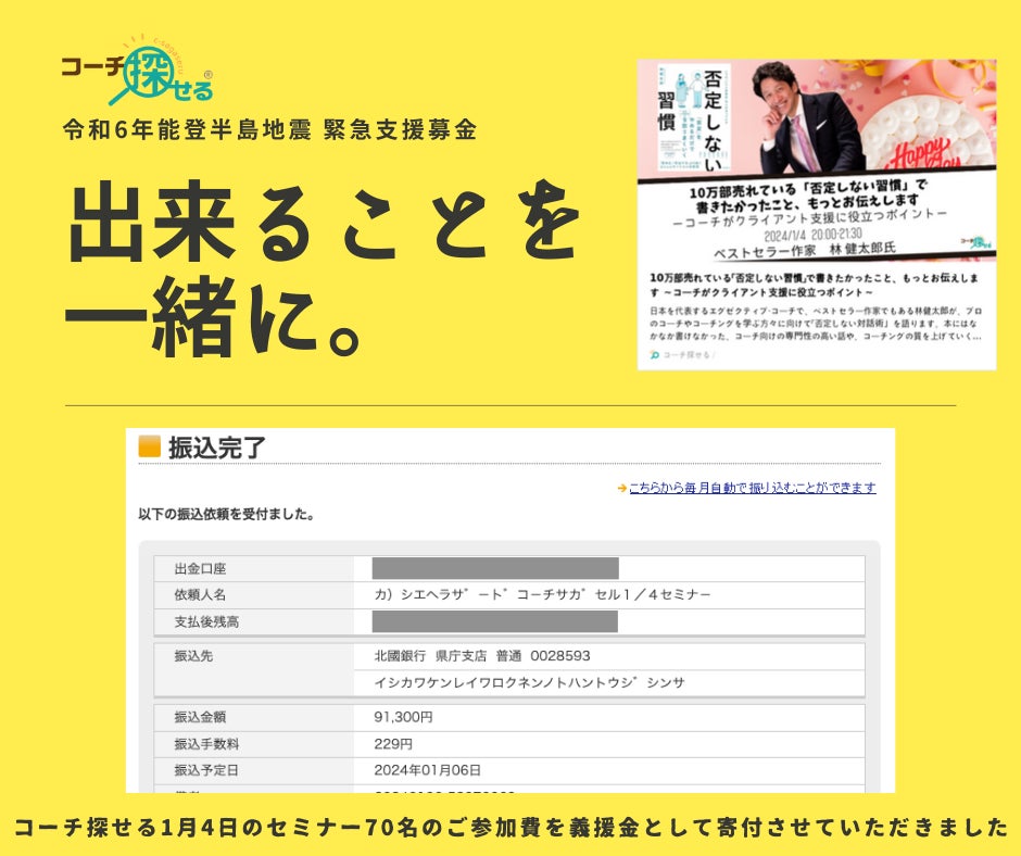 セミナー参加費を令和6年能登半島地震の被災地への義援金寄付いたしました[コーチ探せるセミナーー1月4日開催]