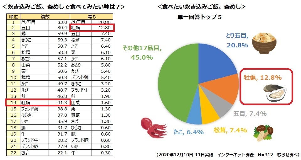 「炊き込みご飯、釜めしで食べてみたい味」として、「牡蠣釜めし」は単一回答では2位となり、嗜好性が非常に高い釜めしです(2020年(株)むらせ調べ)。葉山で30年、行列ができる釜めし専門店「葉山鳥ぎん」では、11月~1月の冬季限定で販売しており(※1)、季節限定の釜めしとしてはダントツ1位の販売数を誇る人気の釜めしとなっています。