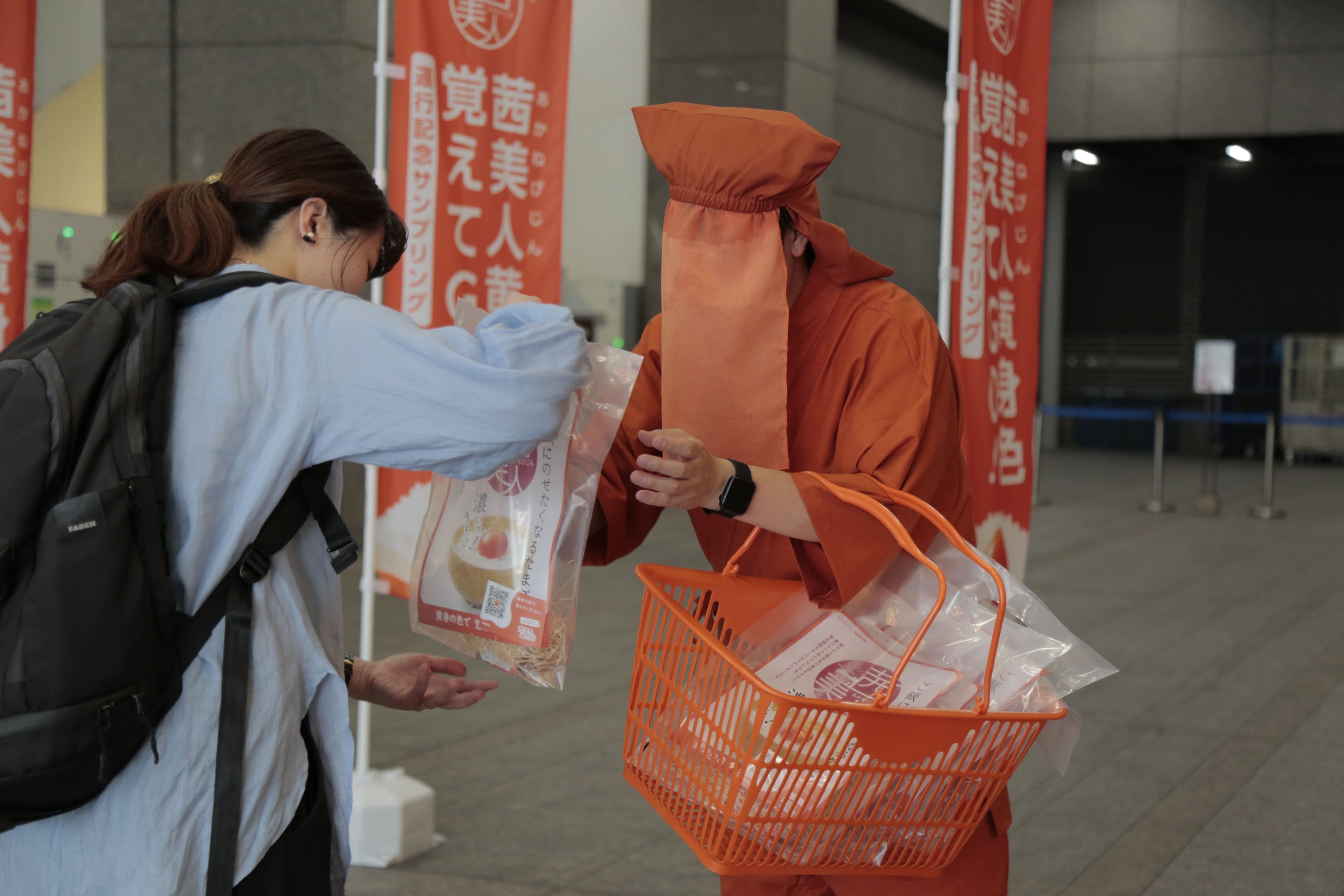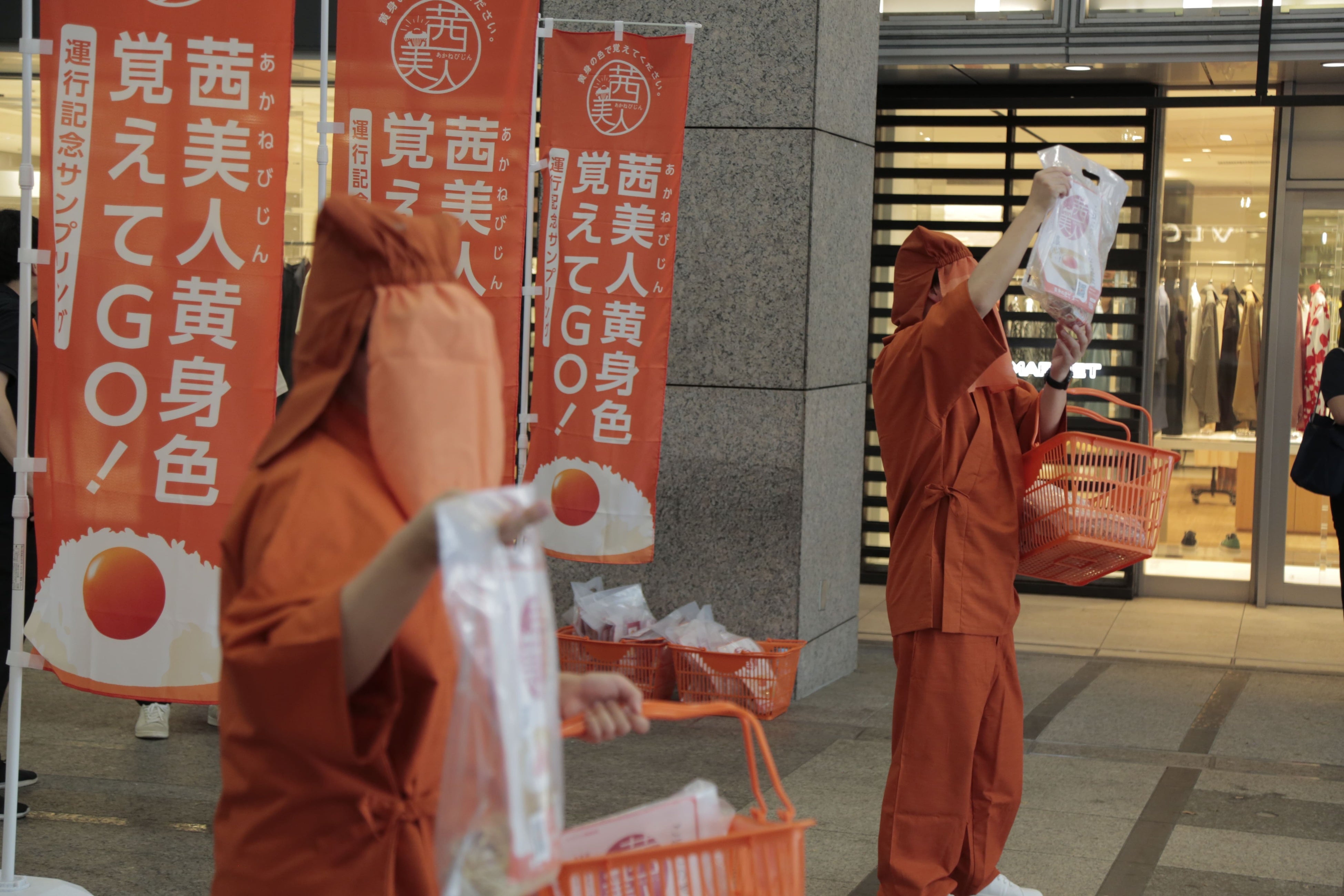 茜色の装束に身を包んだスタッフ“茜子”たちが、『茜美人』2個入りパックを中央線ユーザーの皆さまへ直接手渡しでお届けします。実際の『茜美人』を目にして、触れて、味わうことで、“黄身の色で覚えてください”。