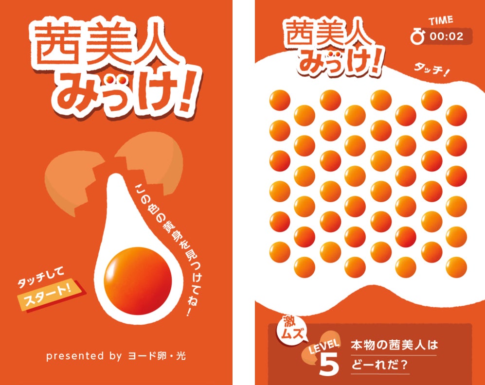 ずらりと並ぶ黄身の中から“本物の茜美人”の黄身を見つけ出す、記憶力と観察眼が試されるゲームを開発しました。
