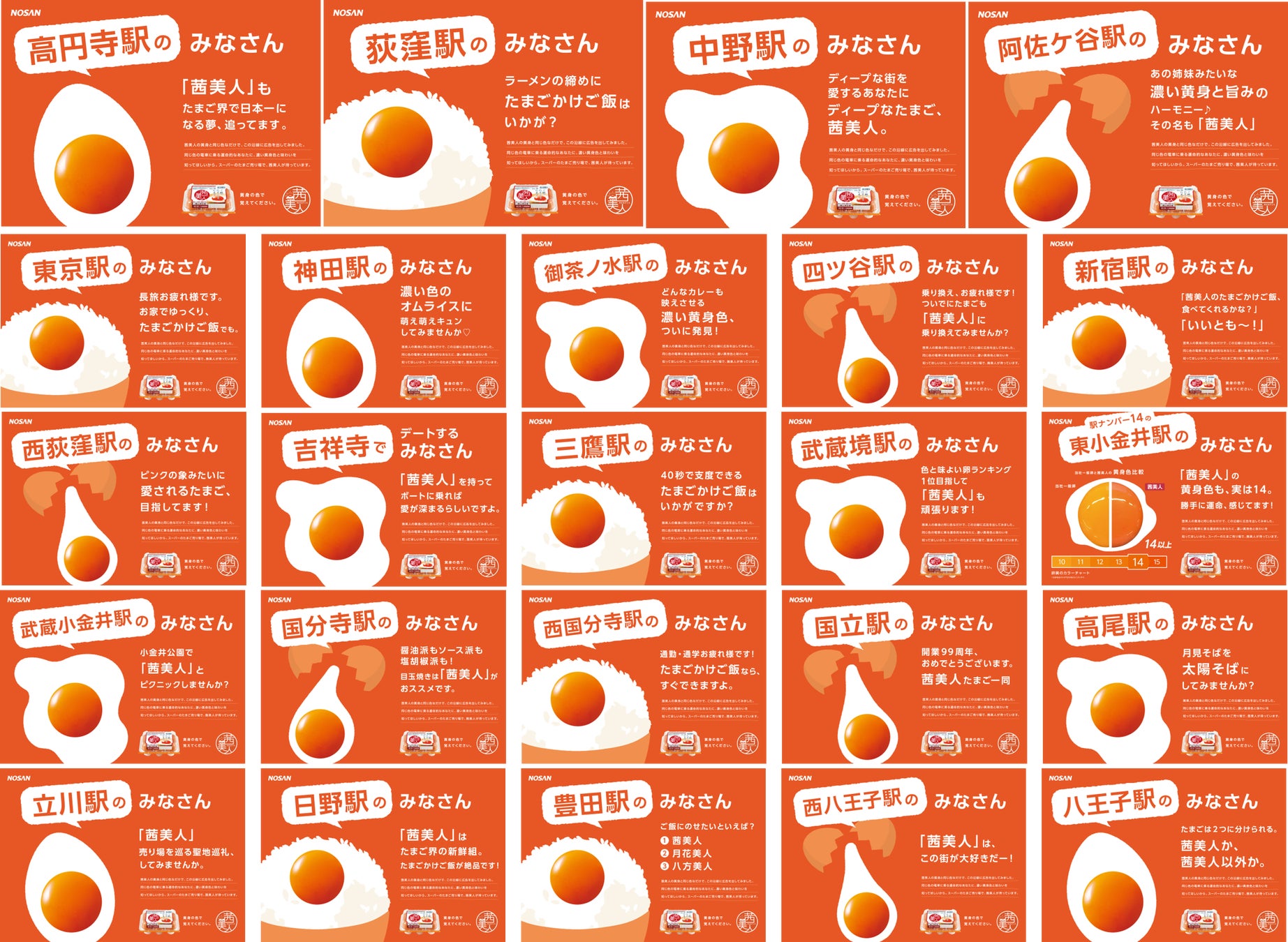 JR中央線快速全24駅には、路線にお邪魔する『茜美人』から、各駅に異なるご挨拶文を掲出。駅名や地域特性と“濃い黄身色”をかけ合わせた言葉遊びを展開します。