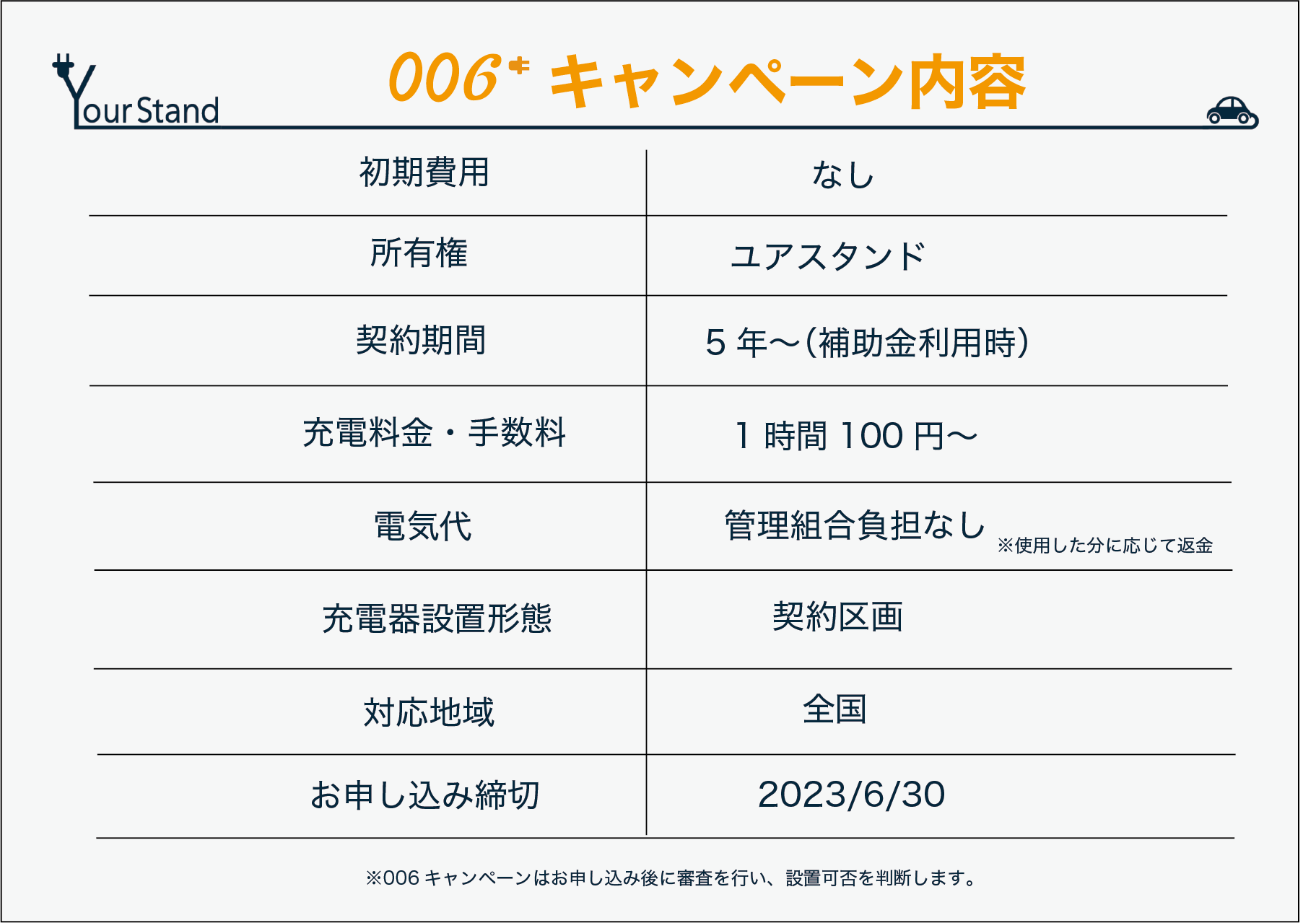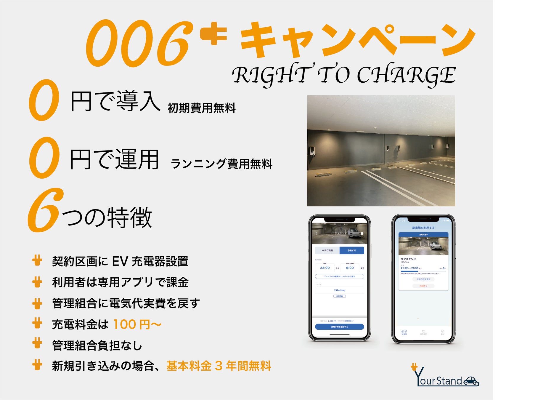 弊社は通常、管理組合が充電器を所有する有料マイスタンドプランを提供させていただいておりますが、今回、初期導入費用やランニング費用をかけたくない管理組合でもEV充電設備が導入できるように、006キャンペーンを開始させていただきました。