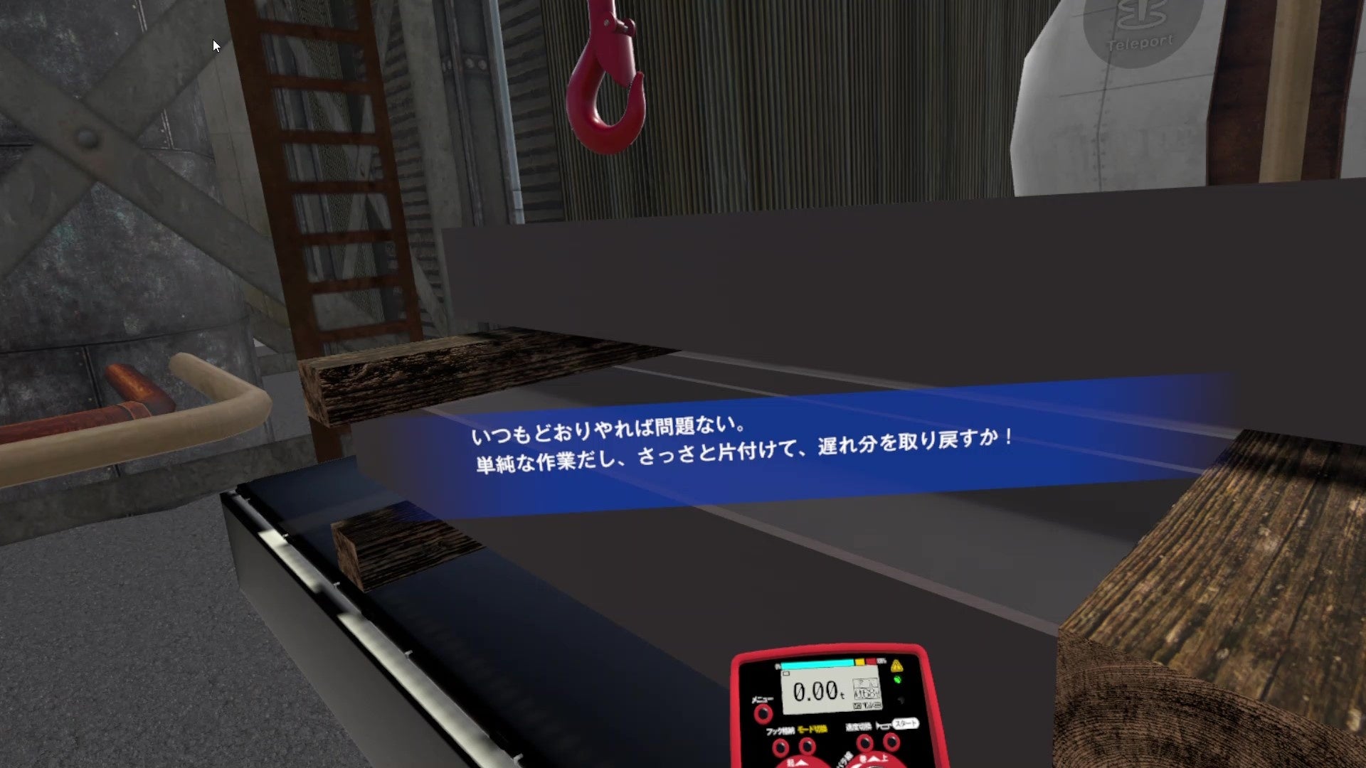 ラジコン(液晶ラジコンJOY、もしくはスイッチ式ラジコン)を使用して、VR内で荷の積み下ろし等の作業を行っていただきます。一部危険な作業がありますが、時間がなく焦っていたり、危険と認識せずに作業を進めます。