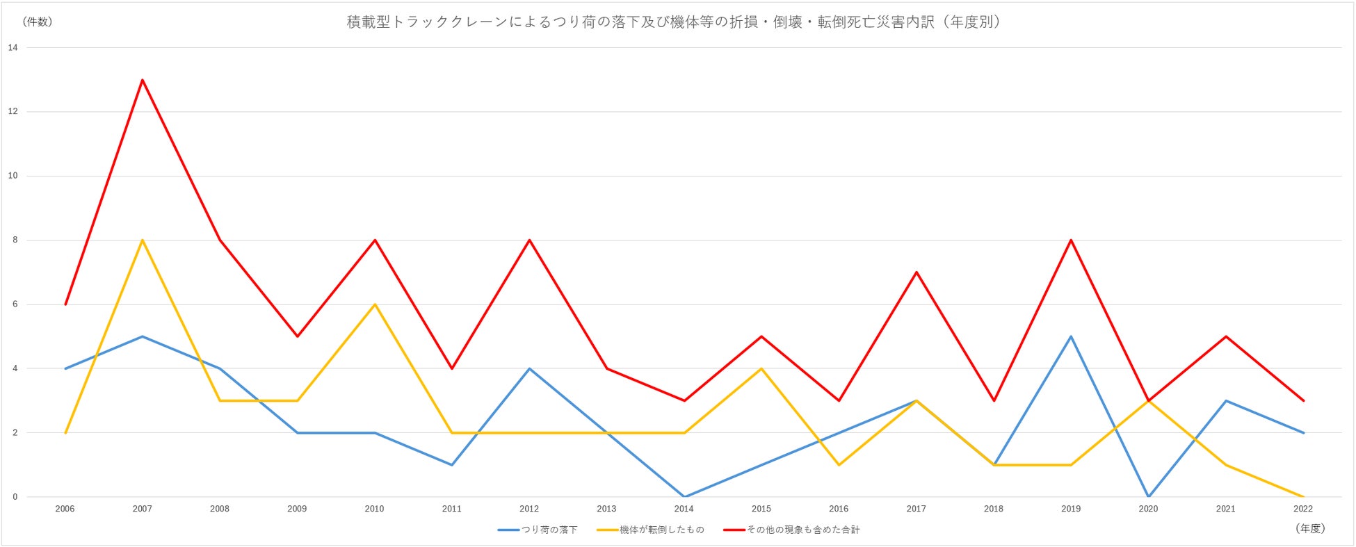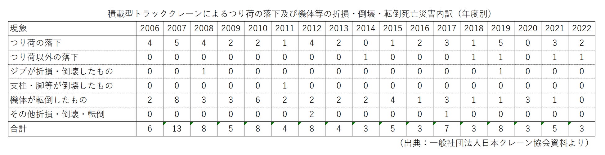 小型移動式クレーンを起因とした死亡災害件数は、移動式クレーン構造規格の改正(モーメントリミッターの装着義務)や、小型移動式クレーンメーカーの努力により年々減少傾向にありますが、未だに年間数件発生しているのが現状です。