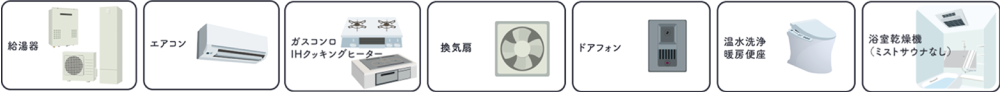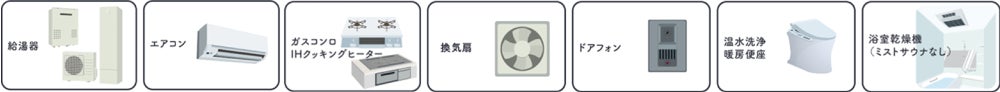 給湯器 / エアコン / ガスコンロ・IHクッキングヒーター / 換気扇(3台) / ドアフォン / 温水洗浄暖房便座 / 浴室乾燥機(ミストサウナなし)