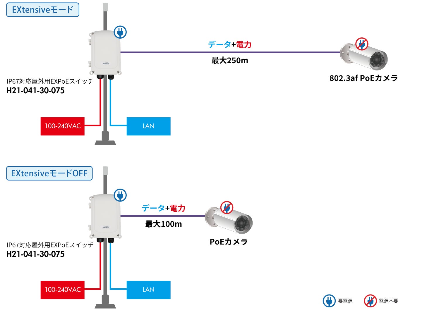 IP67対応の屋外用EXPoEスイッチ 「H21-041-30-075」は、最大250m離れたPD機器に電力を供給可能な「EXモード」を搭載しています。