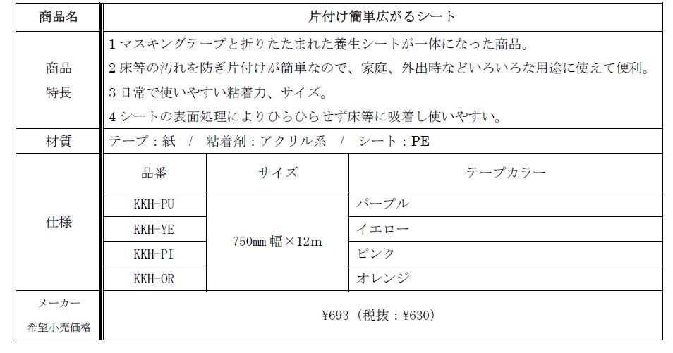 ヤマト株式会社(本社:東京都中央区 社長:長谷川 豊)は、汚れを防止する専用シート「片付け簡単広がるシート」の発売を2月4日(水)より開始し、全国有名文具店、量販店、生活雑貨店、通販等にて随時販売を行います。