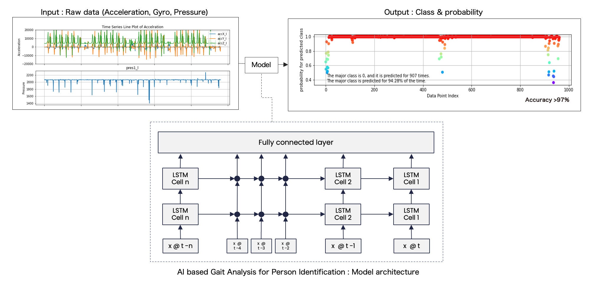 歩容認証技術は、個人の歩行パターンが唯一無二であることに着目しており、新しい認証方法としての可能性を秘めています。当社は、これまで培ってきたAI技術と膨大なデータ解析のノウハウ、さらにスマートインソールからのリアルタイムデータを組み合わせることで、歩容認証AIの実用化に成功しました。