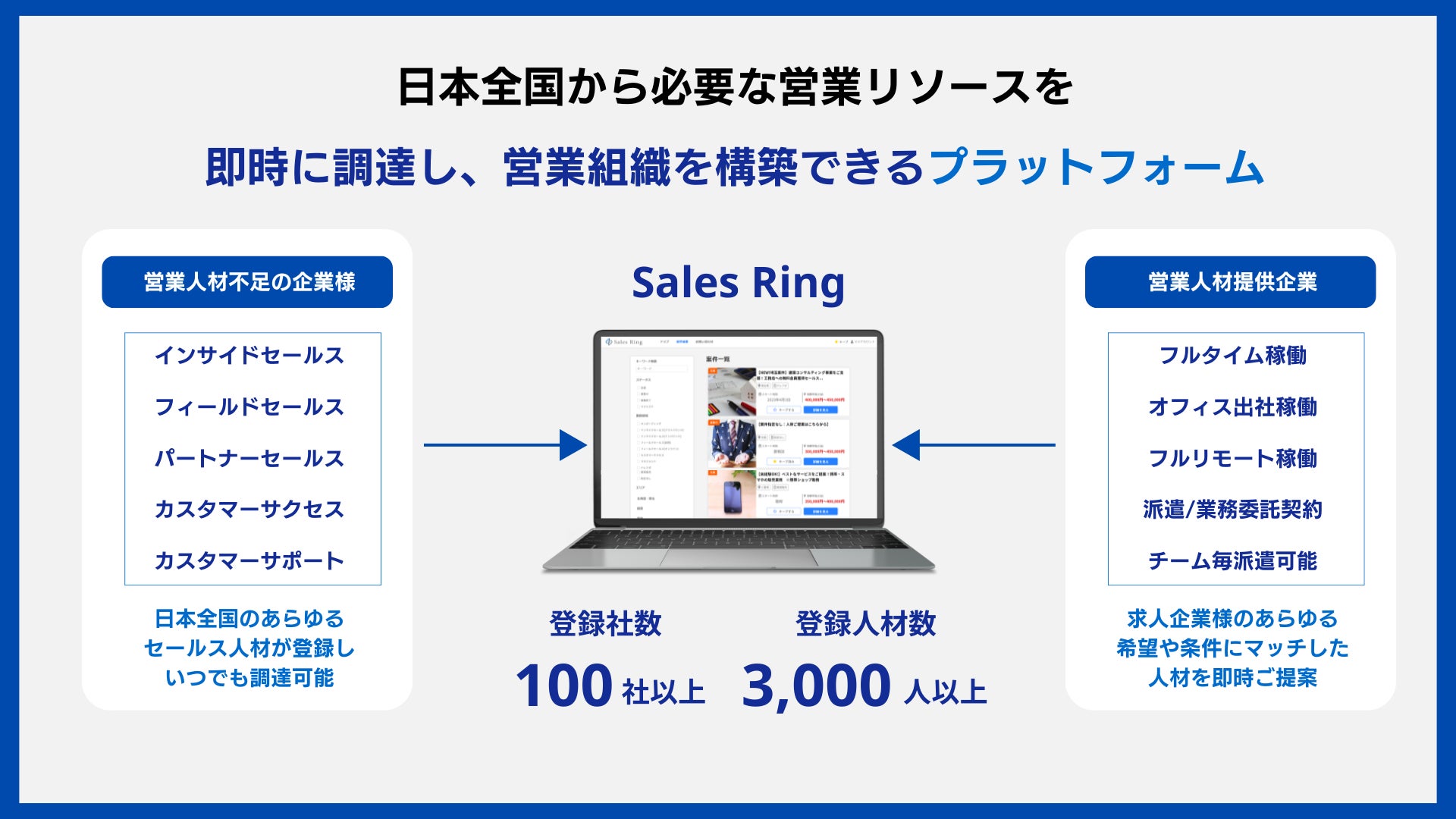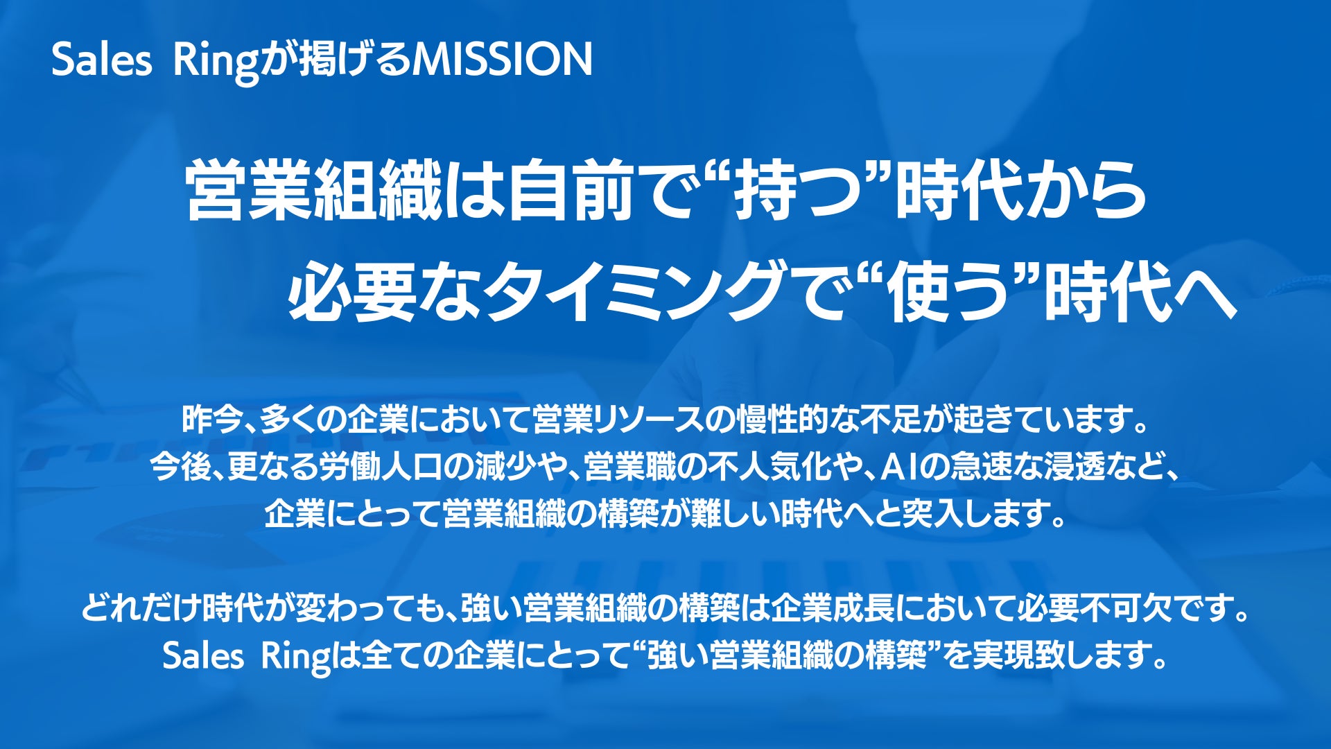 昨今多くの日本企業が人手不足に悩まされていますが、そんな不安な未来でもSales Ringであれば、「いつでも・どこでも・必要な営業人材が・すぐに調達できる」プラットフォームとして、日本の全ての企業が抱える「営業人材不足の課題解決」の解消を実現致します。