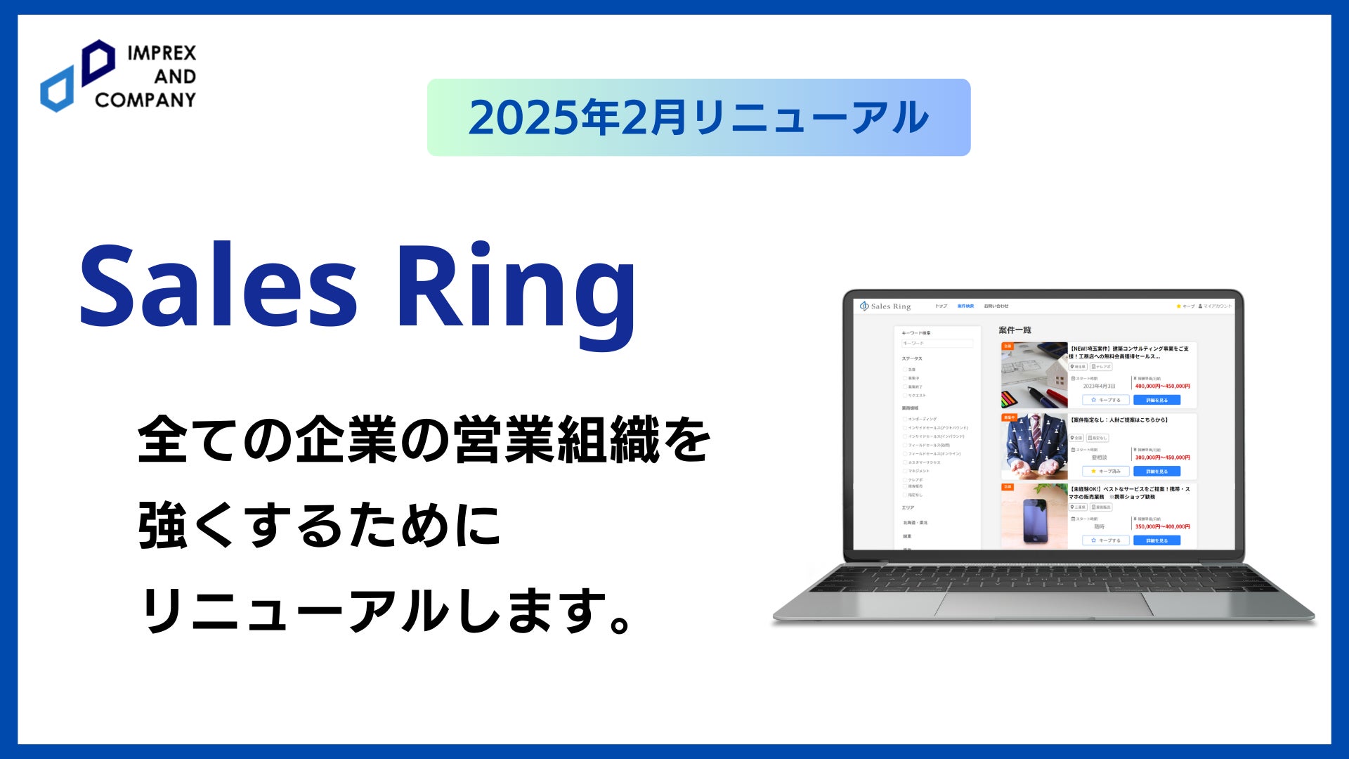 国内の営業支援のパイオニアとして、これまで600社以上の営業課題を解決し続けてきたインプレックスアンドカンパニー株式会社(所在地:東京都港区、代表取締役:伊藤勝成)は、2022年9月にリリースした営業代行業界特化型マッチングプラットフォーム「Sales Ring」を、慢性的な営業リソース不足の課題を抱えている全ての企業にご利用頂けるサービスとしてリニューアルいたします。