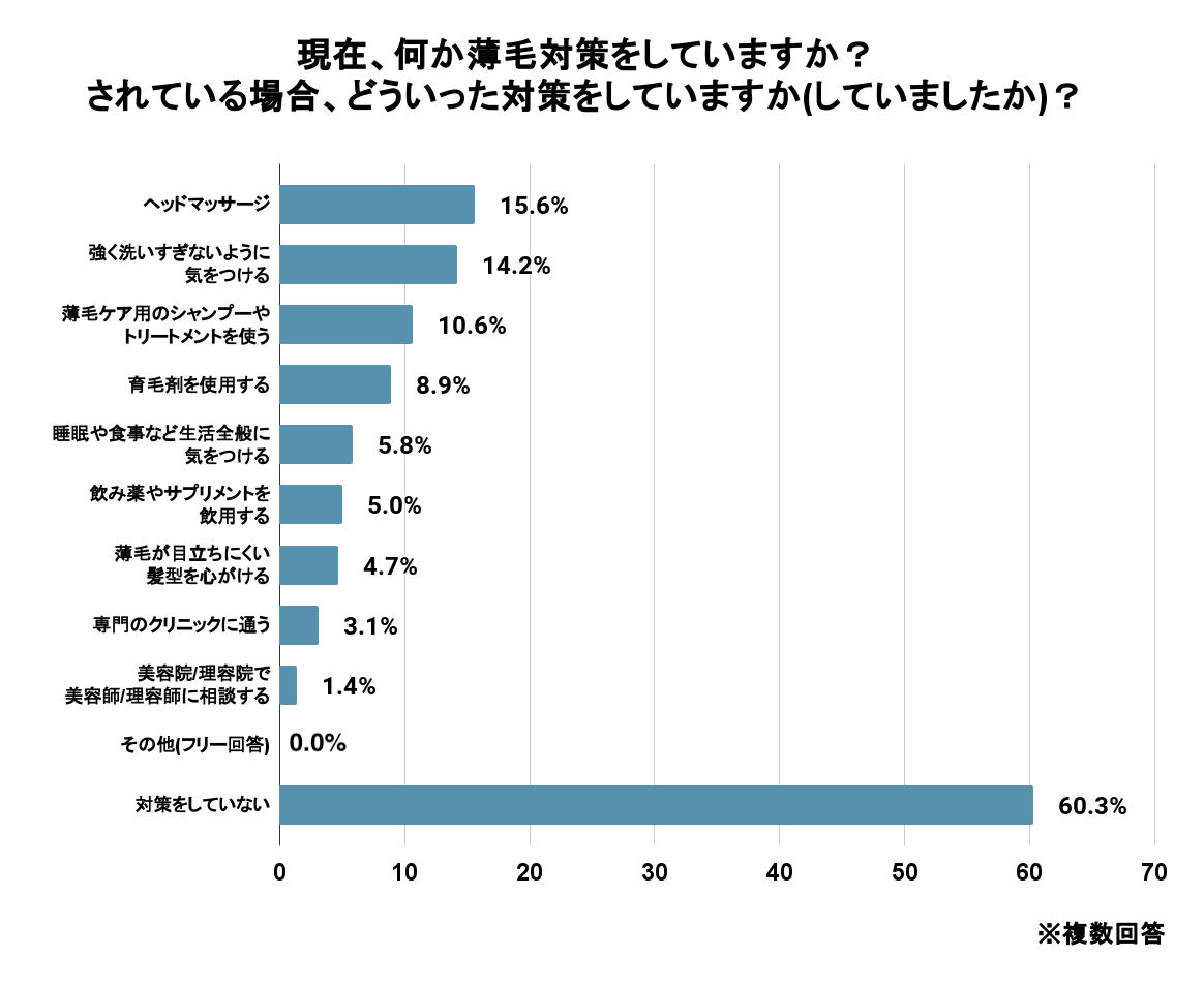 薄毛対策について質問したところ、「対策をしていない」と回答した方は60.3%で、約4割の20代前半男性が薄毛対策をしているということがわかりました。行なっている対策としては、「ヘッドマッサージ」(15.6%)、「強く洗いすぎないように気をつける」(14.2%)が多く、シャワーなど髪の毛を洗う際に対策をしている方が多いと考えられます。