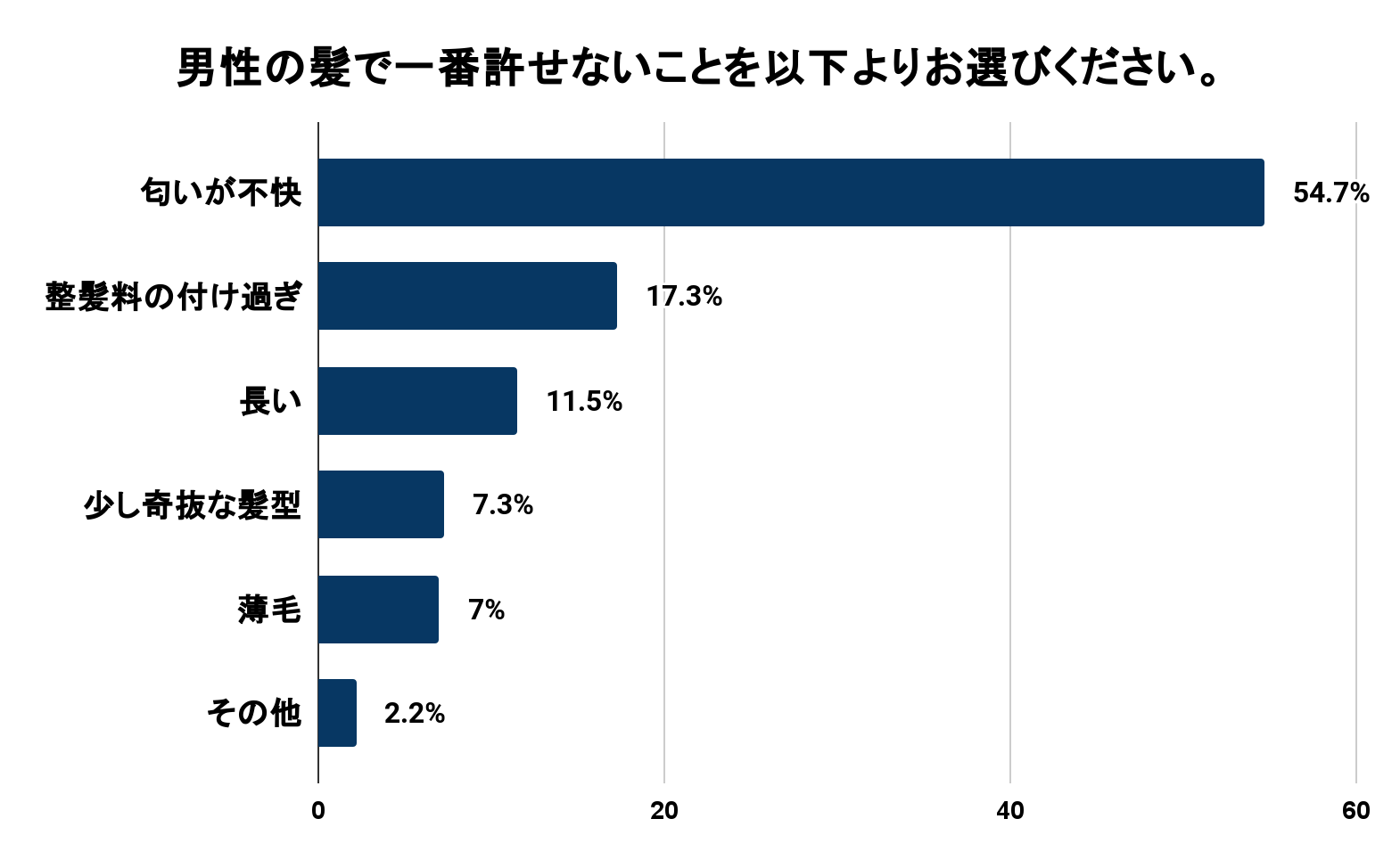 以前にPERCUTが実施した「女性が、男性の髪で一番許せないこと」についてのアンケート調査では、「薄毛」と回答した方は7.0%と少数派で、男性の髪型に対し「その人に似合っていたらOK」と考えている女性が多いとも想像できる結果となりました。この結果から、女性は男性の「薄毛」をあまり気にしていないとも考えられます。
