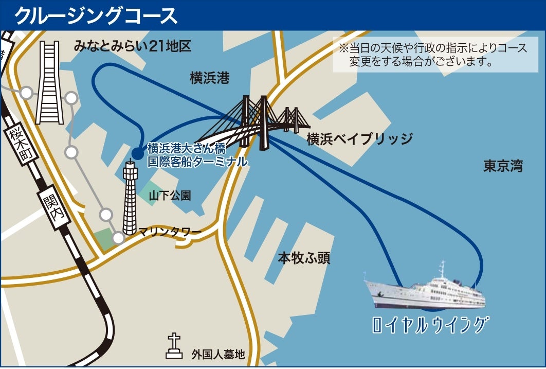 横浜港大さん橋国際客船ターミナルを出航し、ベイブリッジをくぐり東京湾へ。横浜港をゆったりと周遊する110分のコースです。大さん橋に戻る途中で、海の上からヨルノヨの「NIGHT VIEWING」を楽しむことができます。