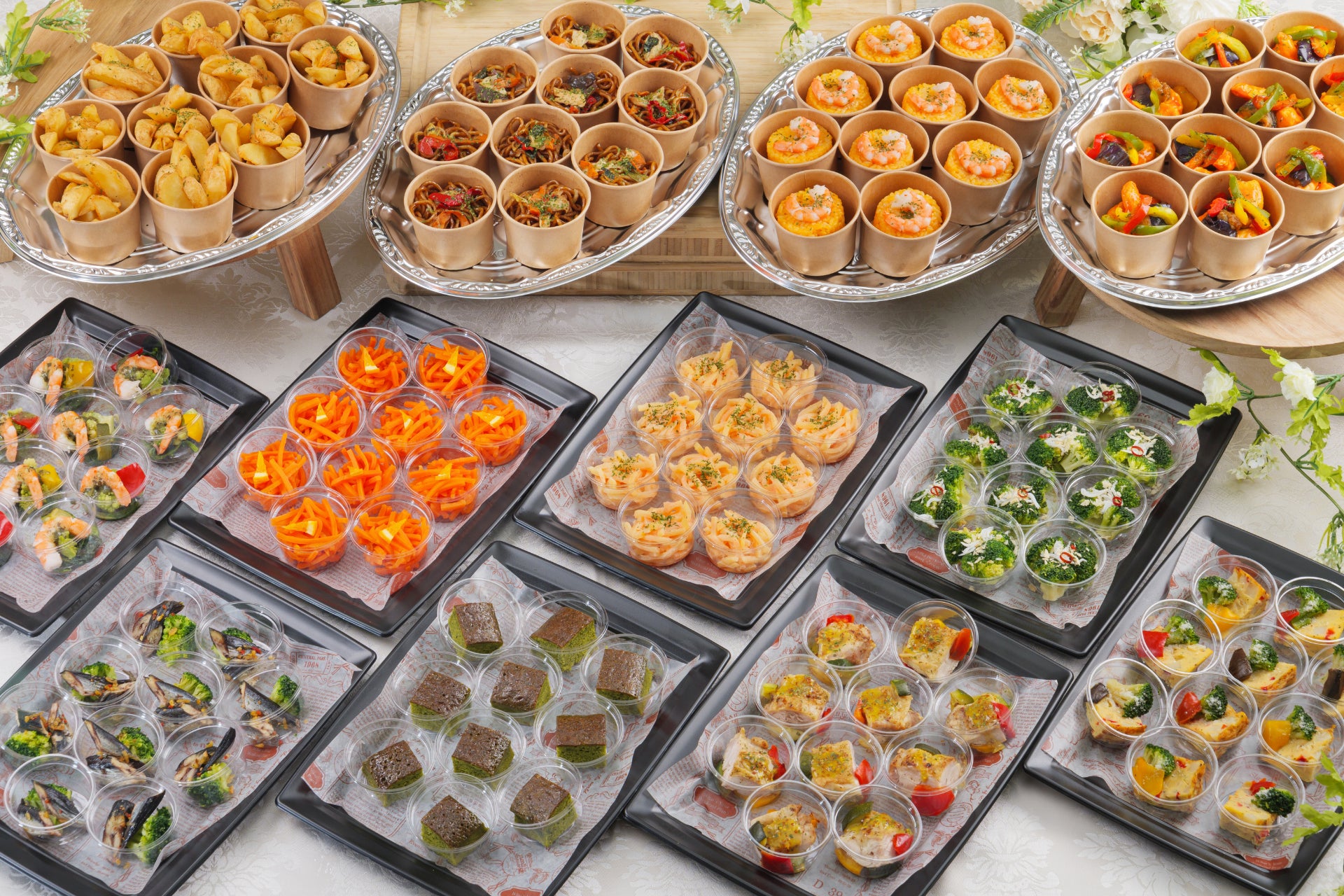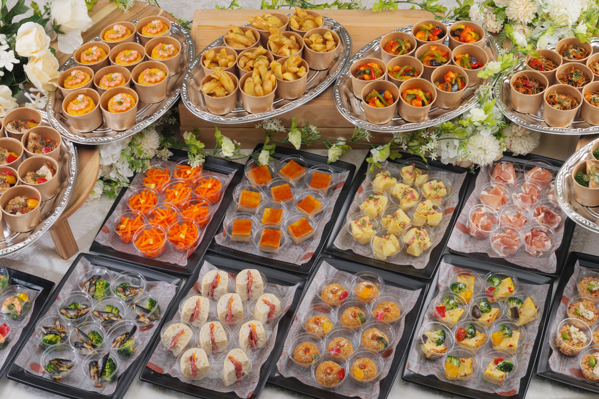 全16種類。〈シーフードピラフ〉〈トリュフソースのグリルチキン〉〈四川風エビのチリソース煮〉をはじめとした温製料理と、〈イタリア風オムレツ〉〈トリュフ風味のライスコロッケ〉〈季節のフィンガーフード〉をはじめとした冷製料理をお楽しみいただける豪華セットです。