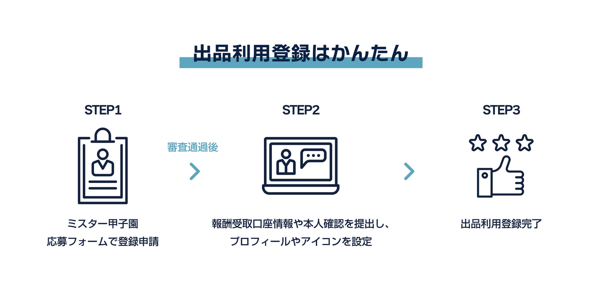 サイト上でサービスを出品するには、ミスター甲子園運営事務局による審査が必要です。応募条件は甲子園(全国高等学校野球選手権大会または選抜高等学校野球大会)に出場した選手とし、ベンチ入りの選手も含むものとします。