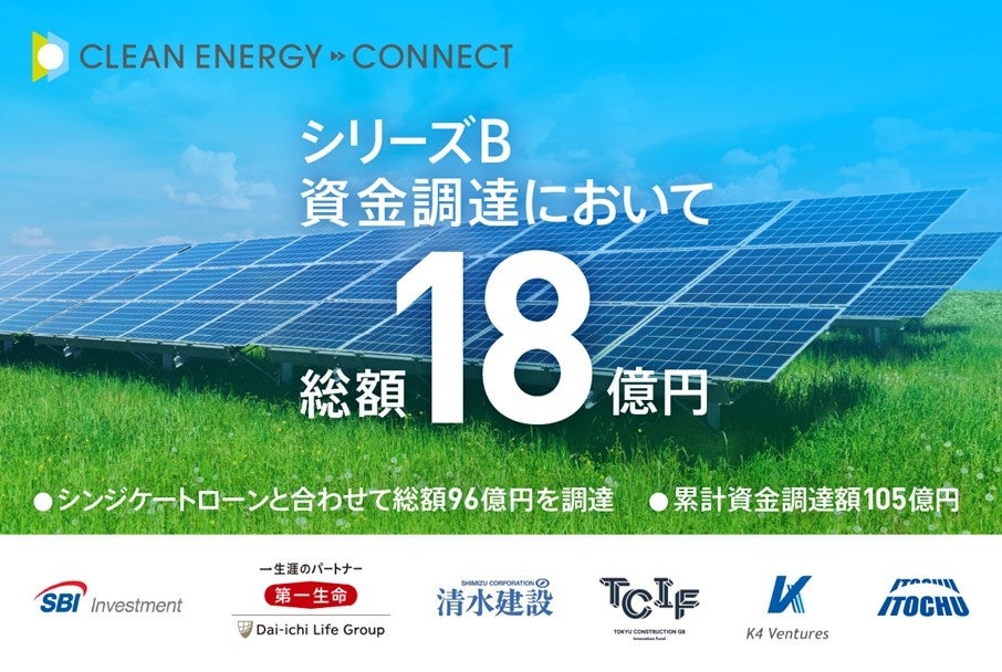 脱炭素経営企業、RE100参加企業等のお客様に対してNon-FIT太陽光発電によるグリーン電力と環境価値をお届けする株式会社クリーンエナジーコネクト(代表取締役:内田鉄平、以下「クリーンエナジーコネクト」)は、シリーズB資金調達において、SBIインベストメント株式会社、第一生命保険株式会社、清水建設株式会社、東急建設-GBイノベーション投資事業有限責任組合、合同会社K4 Ventures、伊藤忠商事株式会社を引受先とする第三者割当増資により総額18億円の資金調達を実施しました。