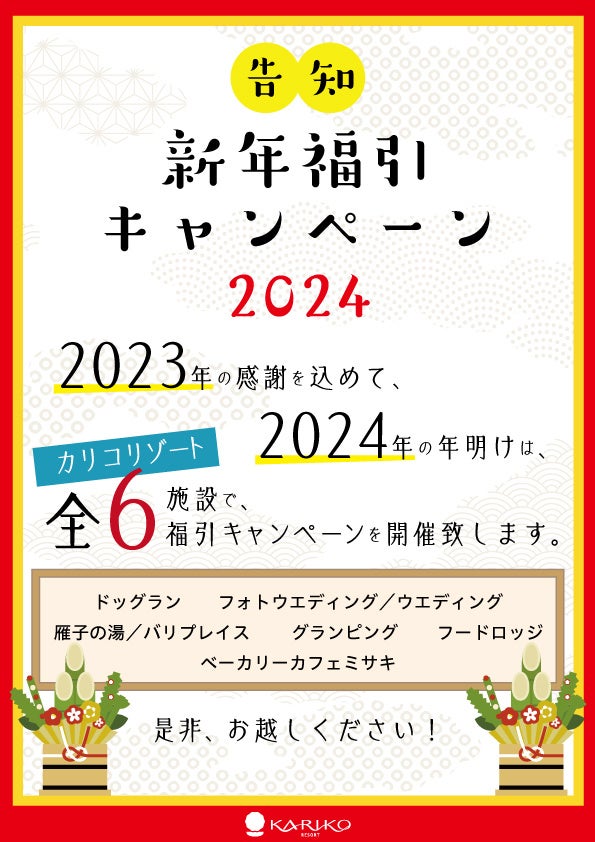 オーシャンビューの贅沢なロケーションが自慢のカリコリゾートは、総天然芝のドッグランをはじめ、愛犬とも宿泊できるグランピング施設、海外で修行を重ねたシェフが作る創作パンが並ぶベーカリーカフェミサキ、心と体を癒し最高の贅沢ができる雁子の湯、バリの雰囲気を取り入れ多国籍な料理をご堪能できるカフェ&レストラン バリプレイスなどの全6施設で、2023年の感謝の思いを込めて「新年福引キャンペーン2024」を開催いたします。