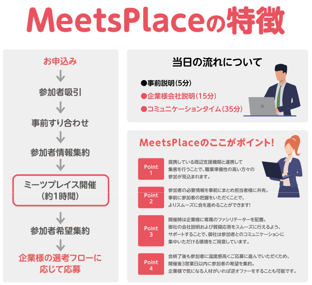 「ミーツプレイス」は障がい者雇用に特化した成果報酬型オンライン企業説明会です。通常の説明会では成立しにくい障がい者と企業のマッチングを、アテンドスタッフがきめ細かくサポートすることで採用に導く形式をとっています。