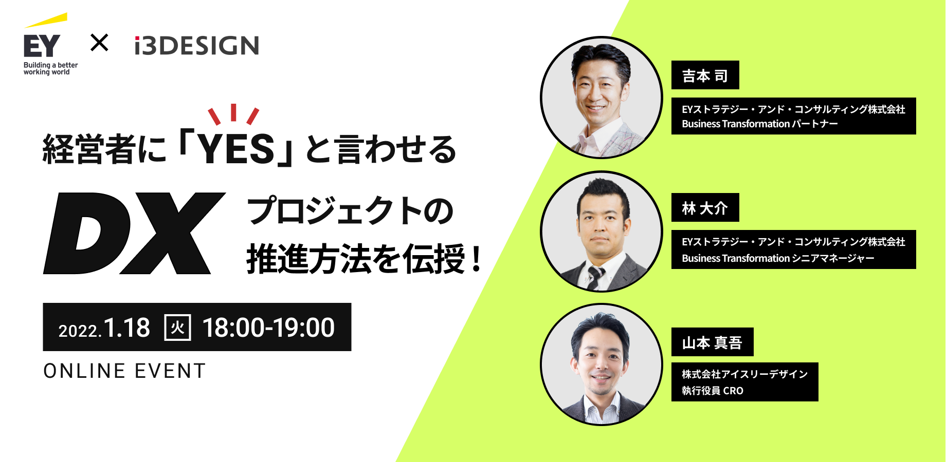 株式会社アイスリーデザイン(本社:東京都渋谷区、代表取締役:芝陽一郎、以下:アイスリーデザイン)は、EYストラテジー・アンド・コンサルティング株式会社 パートナー 吉本 司氏、林 大介氏らと共同で、無料オンラインセミナー「経営者にYESと言わせるDXプロジェクトの推進方法を伝授!」を2022年1月18日(火)18時より開催いたします。