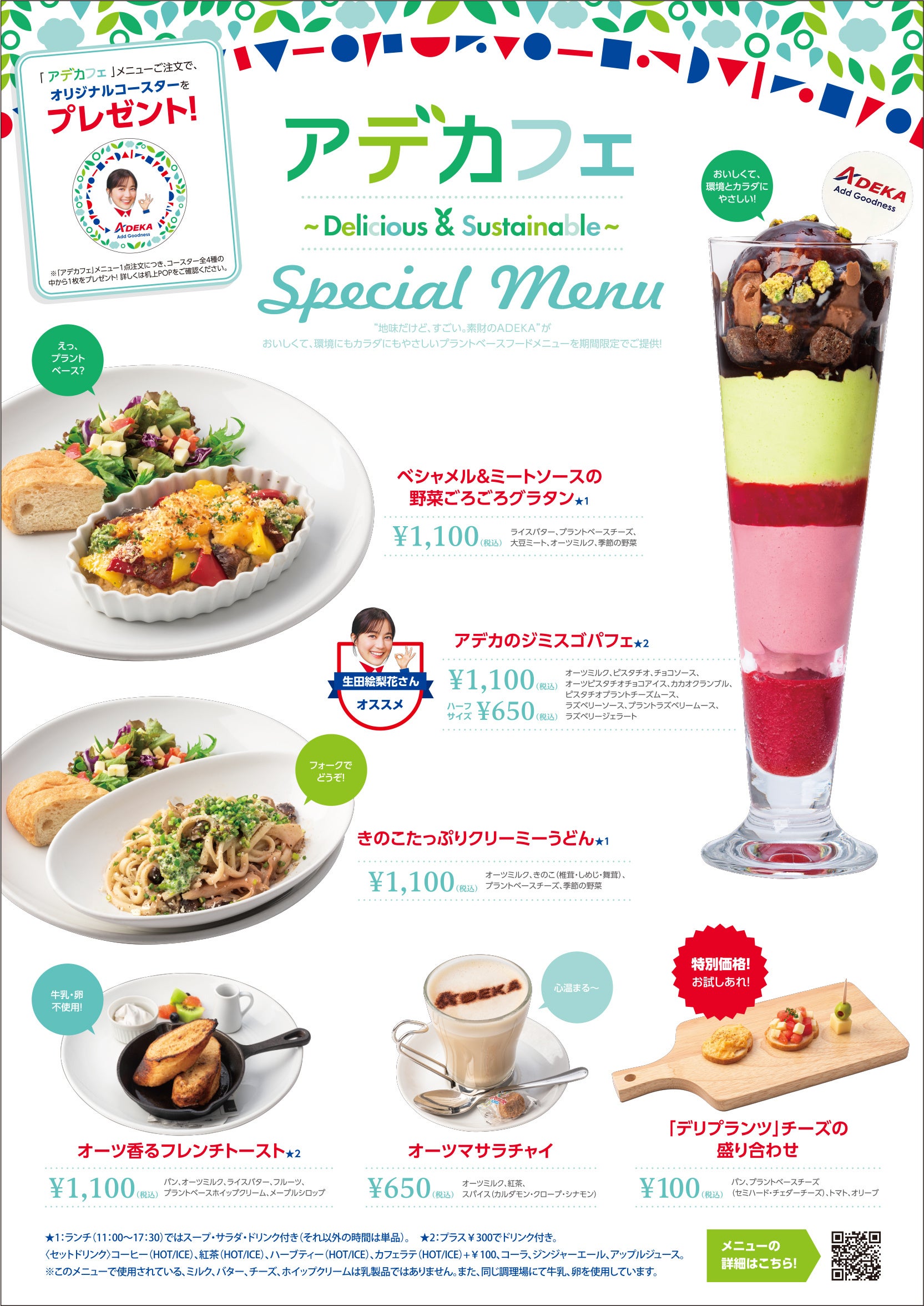 「アデカフェ ~Delicious & Sustainable~」は、ADEKAがB to Bビジネスの域を超え、環境負荷低減や健康志向、食料の安定供給などで注目を集めるプラントベースフードを、もっと多くの方に広めていくための企画です。“従来の常識を覆すおいしさ”にこだわり、メニューを開発しました。「アデカフェ」では、当社イメージキャラクター・生田絵梨花さんオススメの「アデカのジミスゴパフェ」をはじめとする、豊富なメニューをお楽しみいただけます。