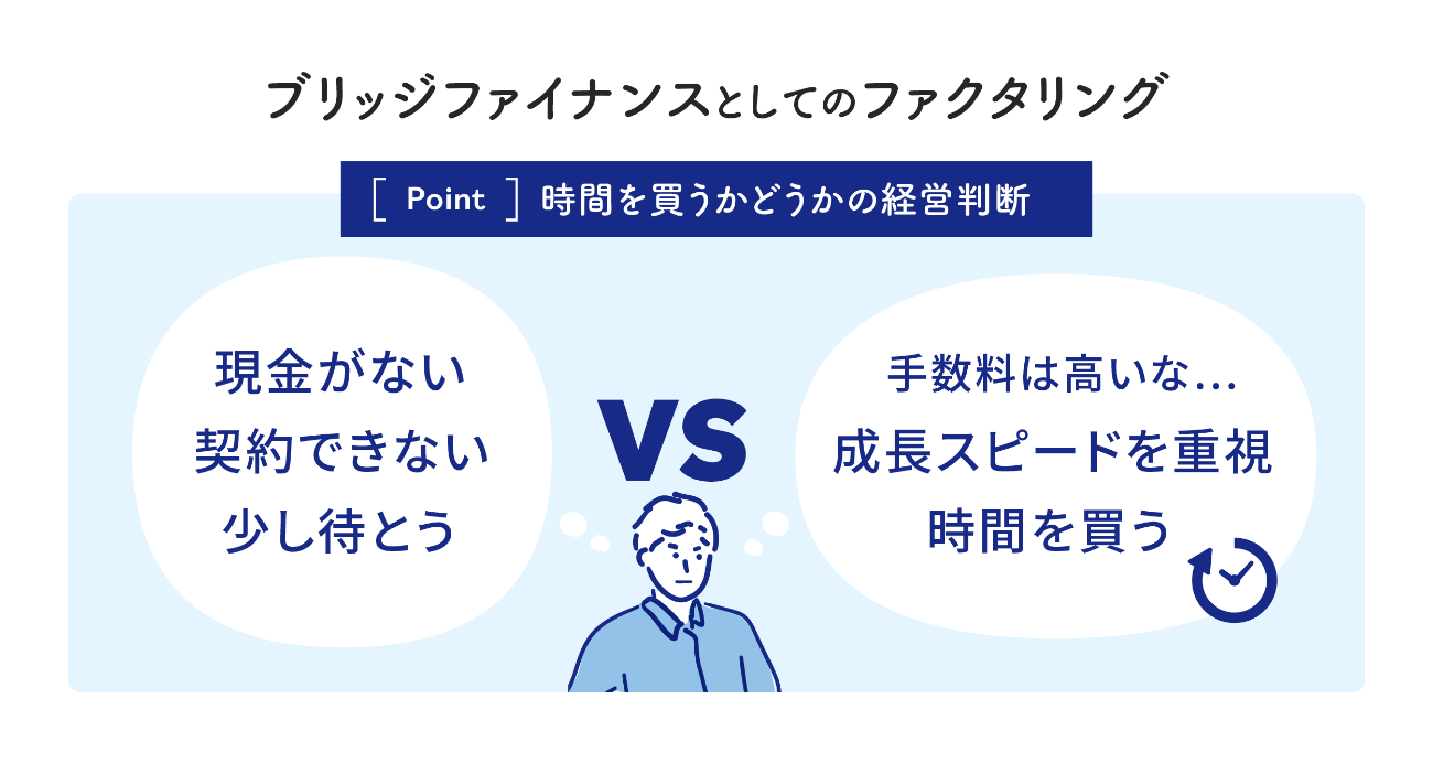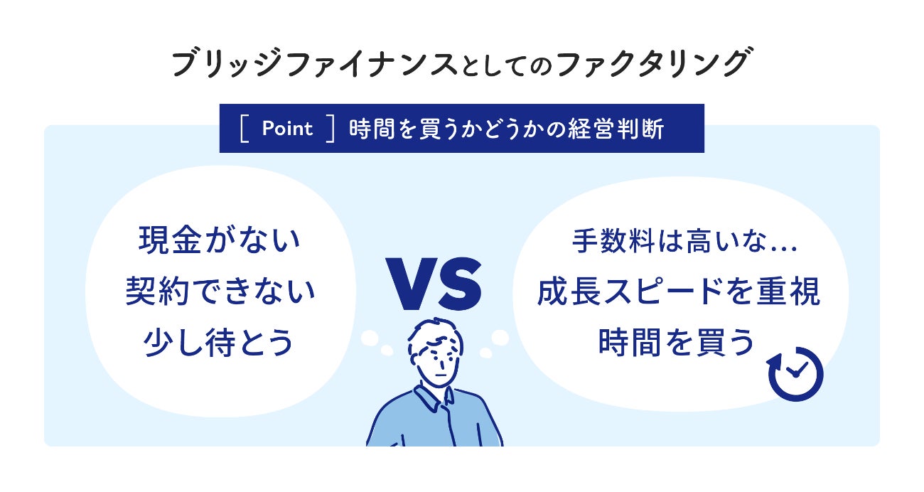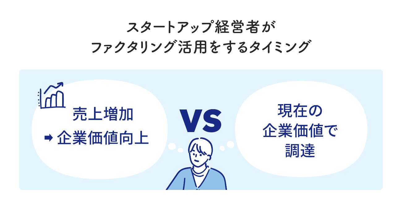 私たちは、ファクタリングを事業拡大における1つの選択肢として活用していただいた事例からスタートアップ/ベンチャー企業の資金調達の手法について学び、ただしく活用していただける情報発信を行っております。スタートアップ/ベンチャー企業でファクタリングを活用できる場面は大きく2つ、(1)増加運転資金への緊急対応で売上成長スピードを重視する際と(2)企業価値の最大化のためのファクタリングを活用する場面が挙げられます。