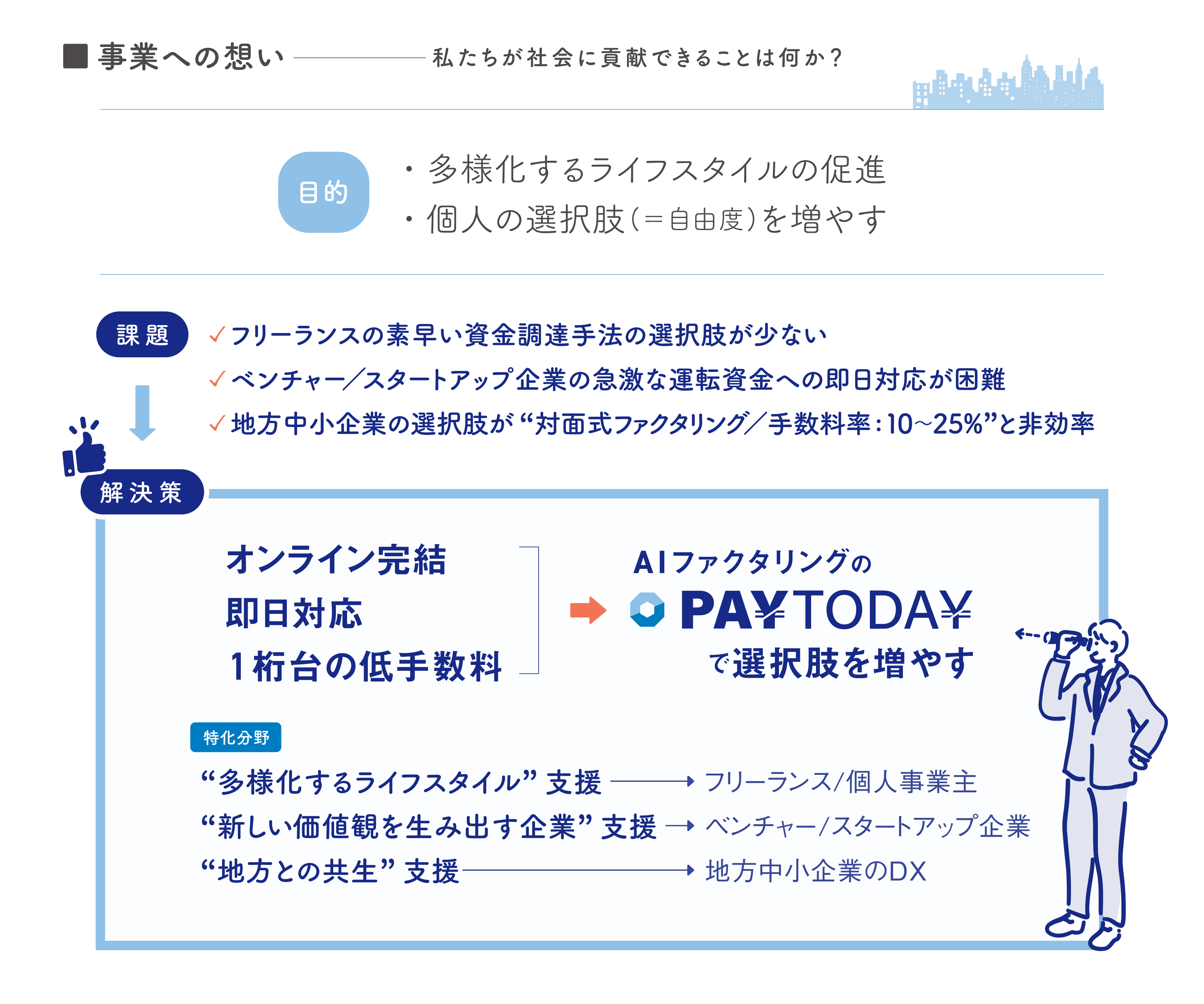 フリーランスの資金調達は、個人信用力に依拠する手法(銀行融資/消費者金融等)が 現時点では主流であり、事業が“急激“に伸びた際の運転資金不足に悩まされています。一方、日本の代表的な銀行融資もこのようなスピードにはなかなか追い付いていない現状があります。 私たちは「フリーランスが活躍する社会の実現の一助を担いたい」と考え、この請求書買取/ファクタリング事業に参入しました。また、事業を推進していく中で『ベンチャー企業による資金調達手法の1つとしての請求書買取/ファクタリング』の活用、『オンライン/非対面型による地方企業のファクタリング利用コストの削減』は私たちが“新しい価値観を提供する企業の増加”、“地方との共生”の一端を担える可能性を感じており、注力しています。