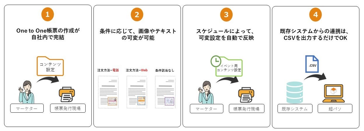 小林クリエイトの超票パーソナライザーは、既存システムから出力されたCSVファイルをそのまま取り込み、ソフト内でデータの結合・変換を行います。そのため、既存システムの大幅な改修を必要とせず、簡単にOne to One帳票を発行することが出来ます。また、印刷会社ならではのノウハウで、お客様コンテンツのパーソナライズ化をサポートいたします。