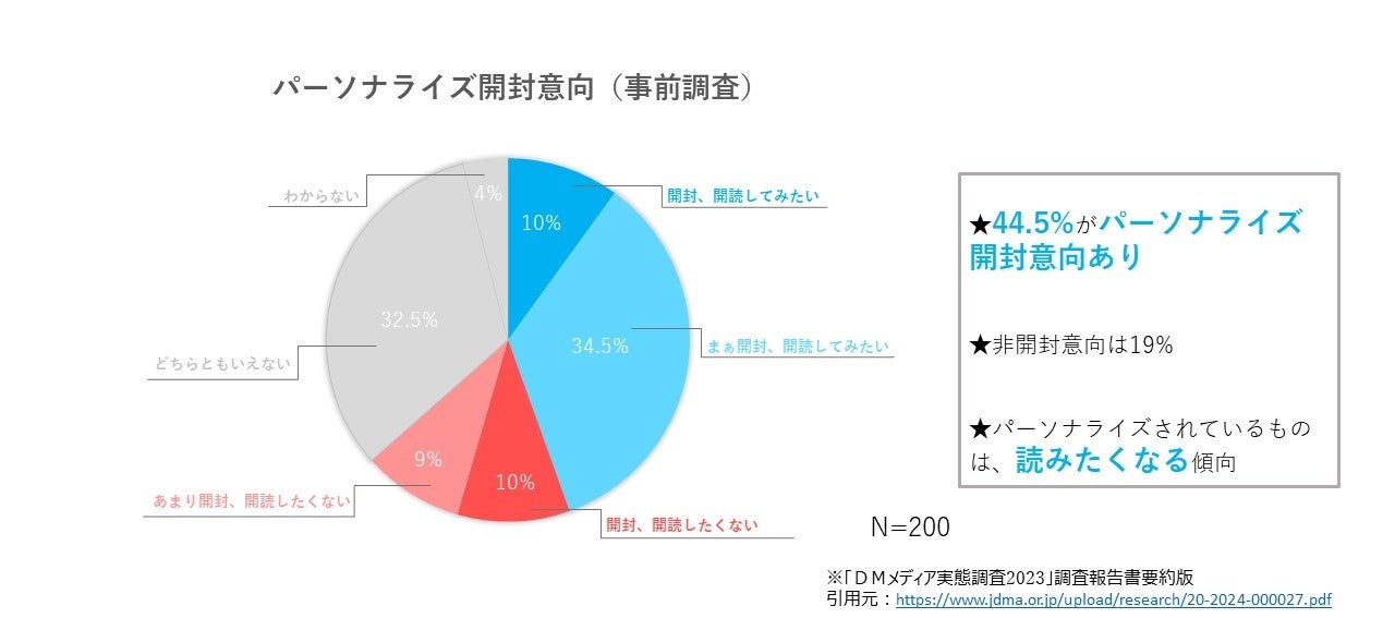 一般社団法人日本ダイレクトメール協会によると、DMのパーソナライズ開封意向として、パーソナライズの開封意向(開封意向あり計)は全体で44.5%、非開封意向計の19%と比べて高い開封意向となっているという調査結果を出しています。