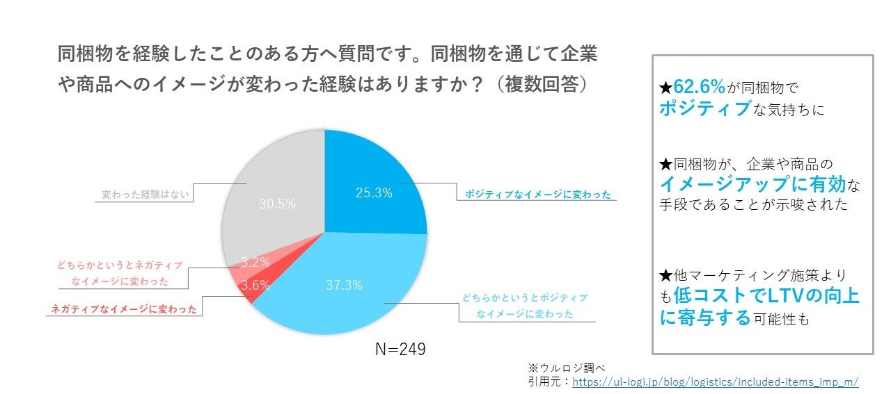 EC物流代行サービス「ウルロジ」、他DM、インターネット事業等を展開しているディーエムソリューションズ株式会社(本社:東京都武蔵野市、代表取締役社長:花矢卓司、以下 DM ソリューションズ)によると、全国の20-60代の男女で特に月に1回以上ECで買い物をされるヘビーユーザー500名を対象に「同梱物に対する消費者実態調査」を実施した結果、同梱物について、ポジティブなイメージを抱いてもらえる施策であるという調査結果を出しています。