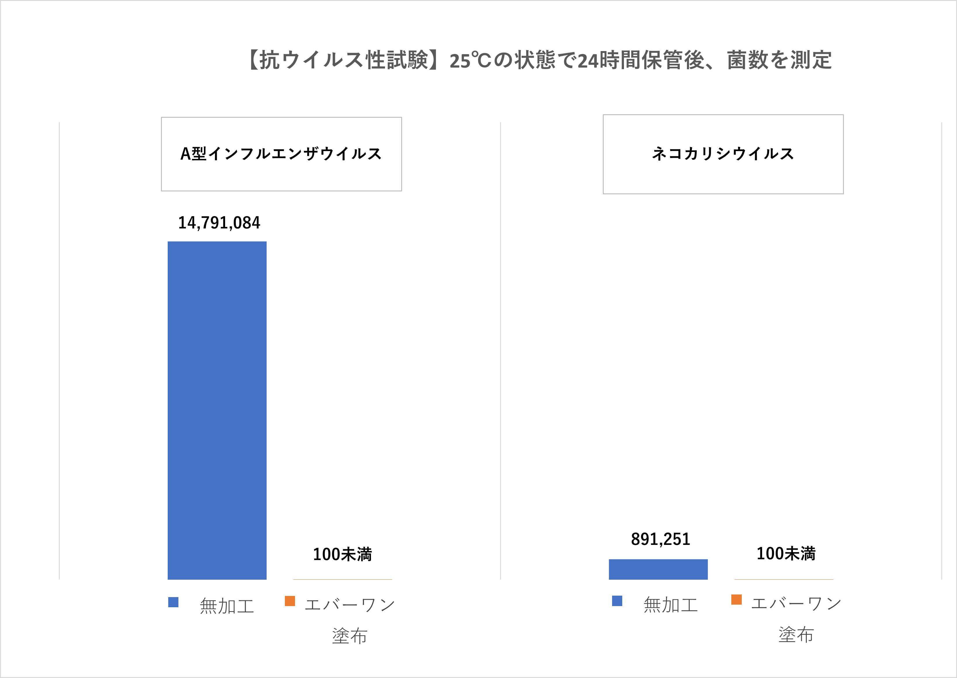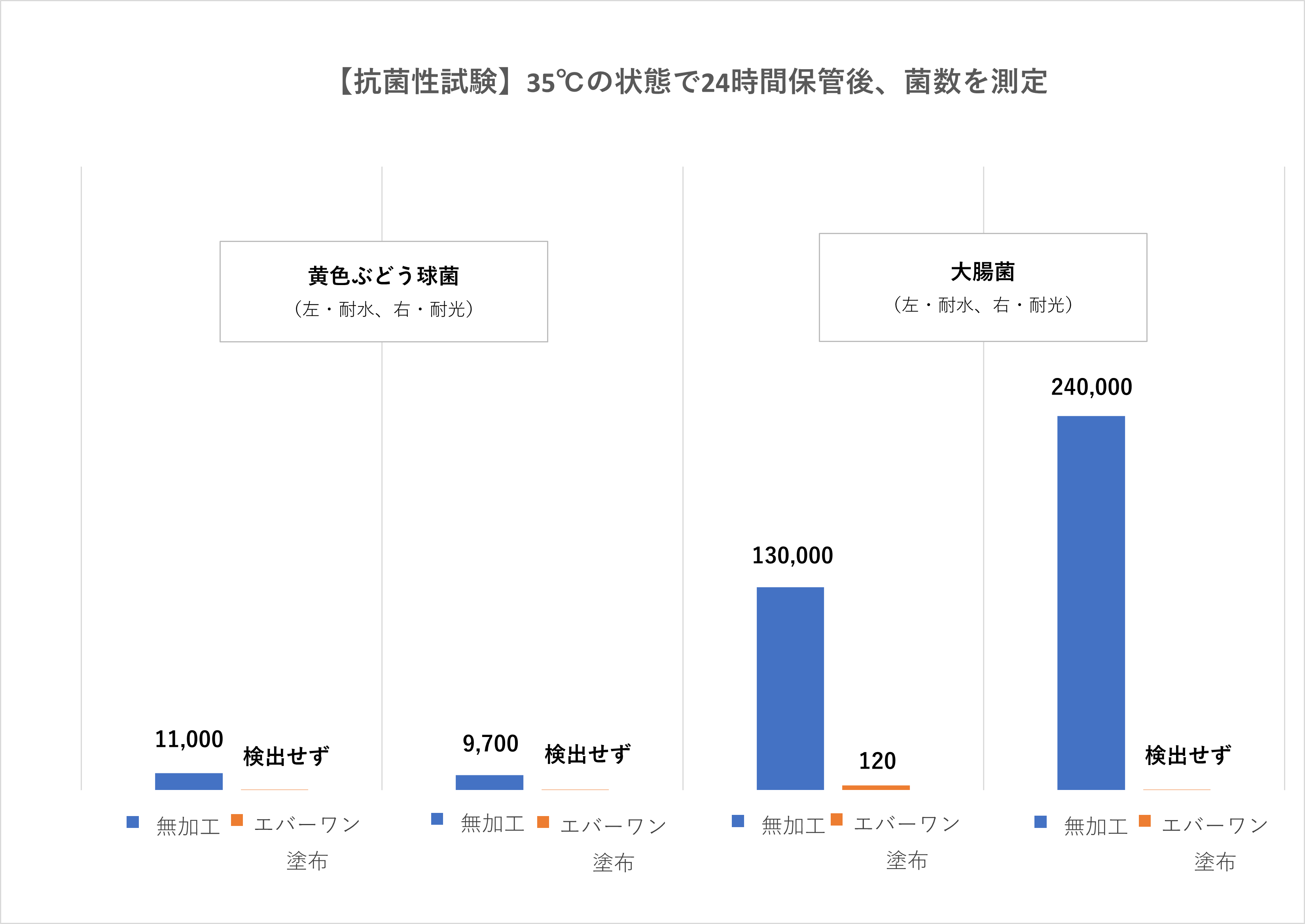 実験方法 | JIS Z2801:2012「抗菌加工製品-抗菌性試験方法・抗菌効果」5 試験にて、エバーワンを塗布した検体で、大腸菌と黄色ぶどう球菌を接触させ24時間後に菌の増殖数(生菌数)を測定する抗菌性試験を実施。 |