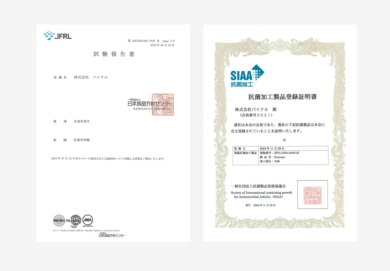 2023年8月、SIAA指定JNLA試験事業者であり農薬・食品添加物分析や異物検査等を行う「一般財団法人 日本食品分析センター彩都研究所」で実施された抗菌性試験において、エバーワンの高い有効性が認められました。