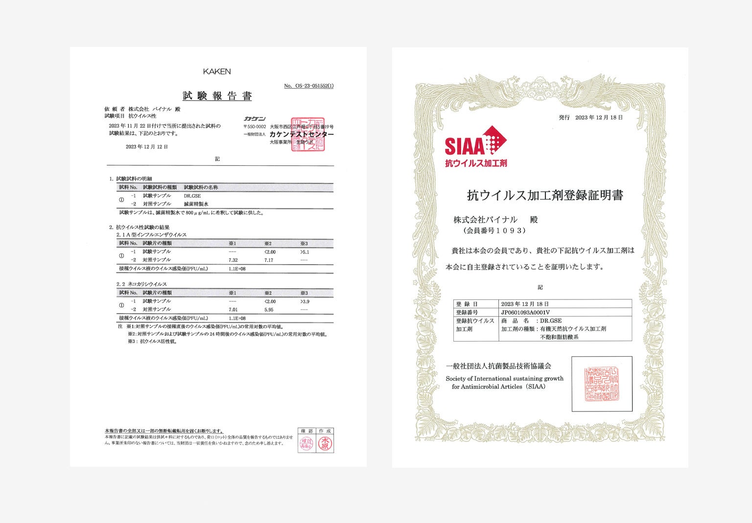上記結果によりDR.GSE及び「Everone」「Everone PRO」は非常に高い抗ウイルス効果が認められ、SIAAの品質管理基準を満たしたことを示す「SIAA抗ウイルス加工剤マーク」認証を取得しました。