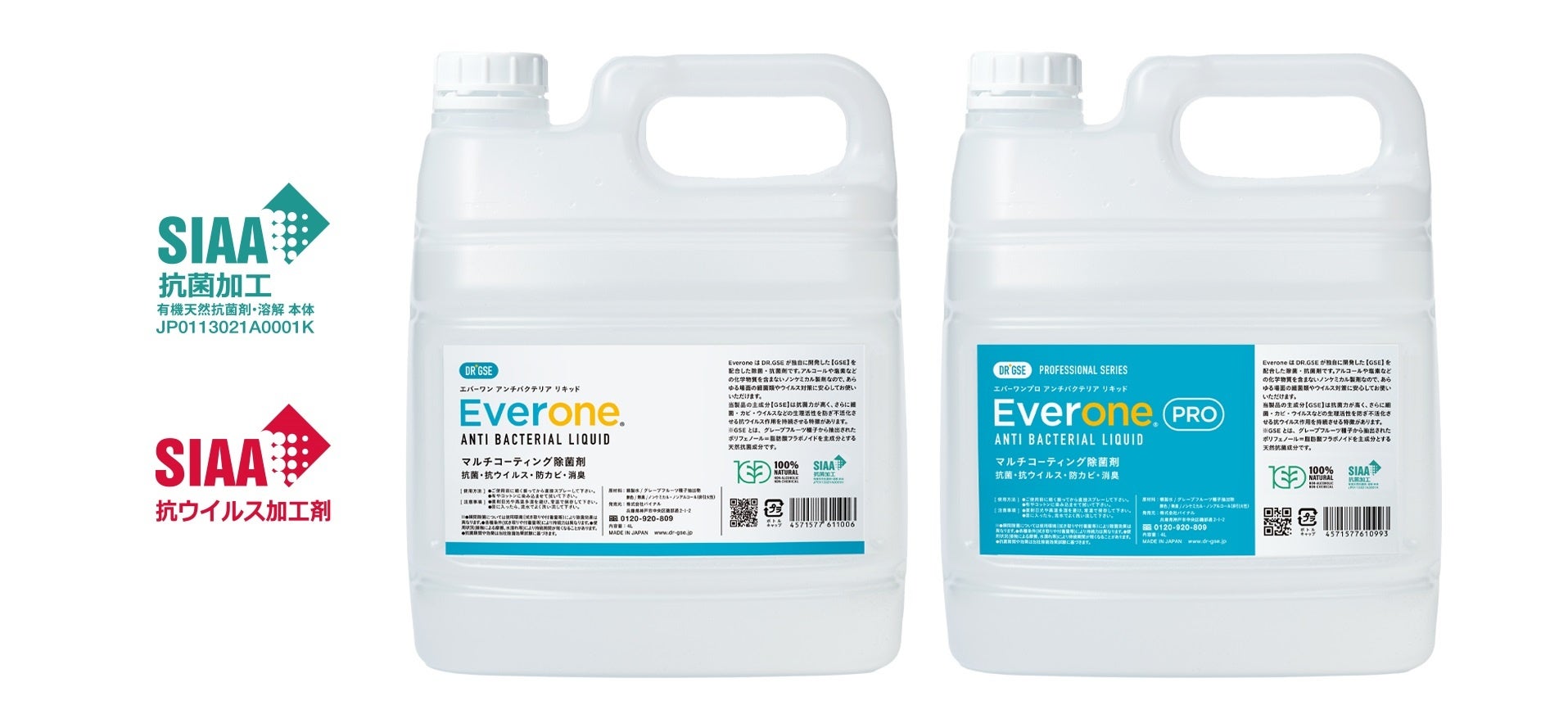 数々の第三者機関での厳しい安全性試験やエビデンスを取得し、天然系液剤として国内で初めてSIAA の品質管理基準を満たし「SIAA抗菌マーク」「SIAA抗ウイルス加工剤マーク」認証を受けた「DR.GSE」及び「Everone」「Everone PRO」は上記の課題をクリアし、より安心で衛生的な環境を実現します。