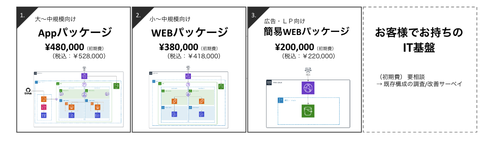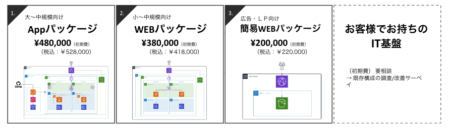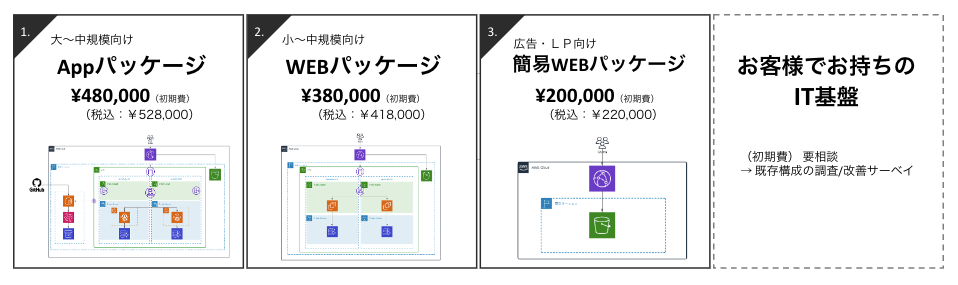 ご要望の多いインフラ構成を、選びやすい3つの種類でパッケージからお選び頂けます。