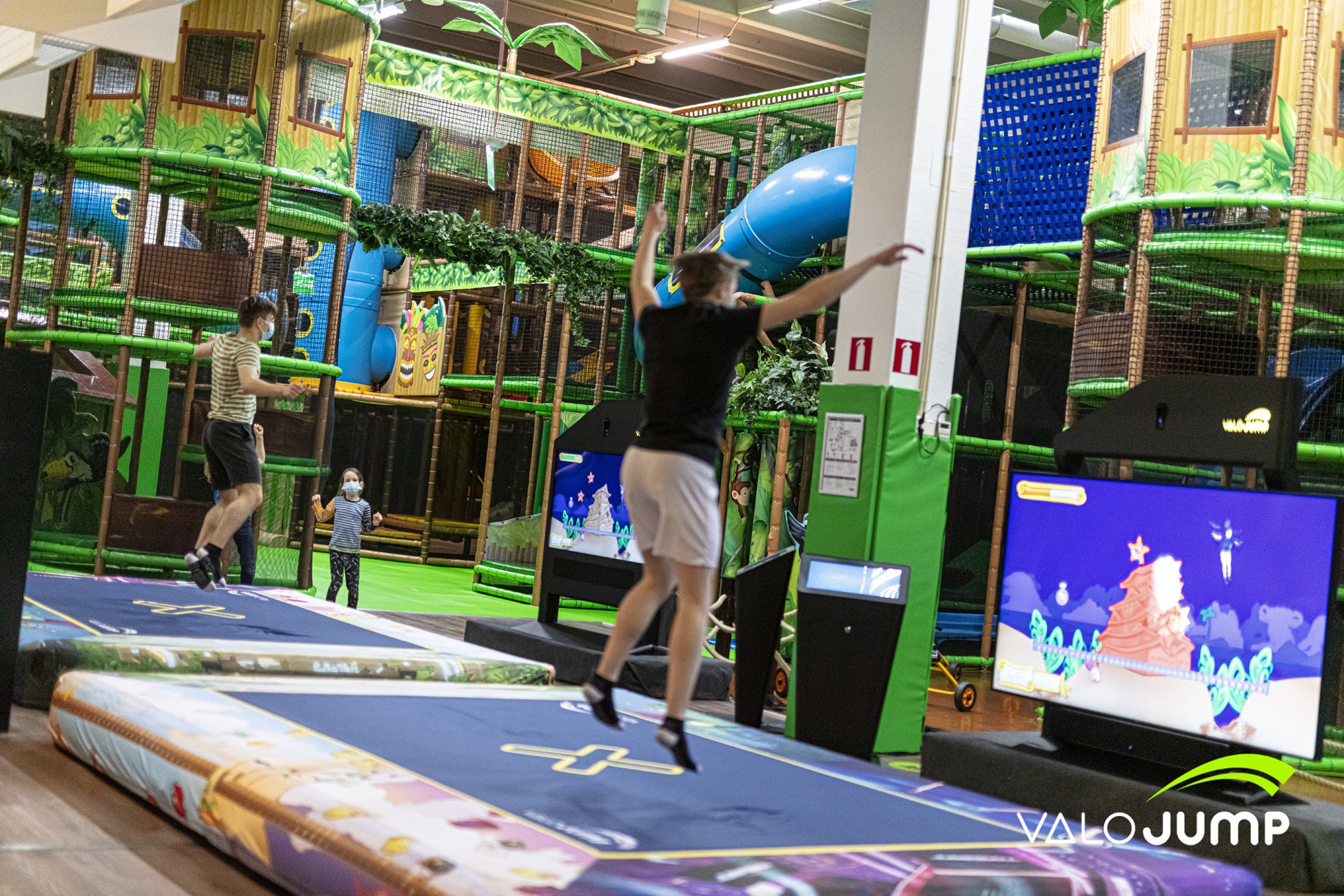 「ValoJump air(ヴァロ・ジャンプ・エアー)」は、エアートラックを使って ゲームの主人公になったような気分を味わえるスポーツ。ジャンプするプレイヤーの姿をカメラがとらえ、正面のモニターのゲーム画面に自分のキャラクターが映しだされます。