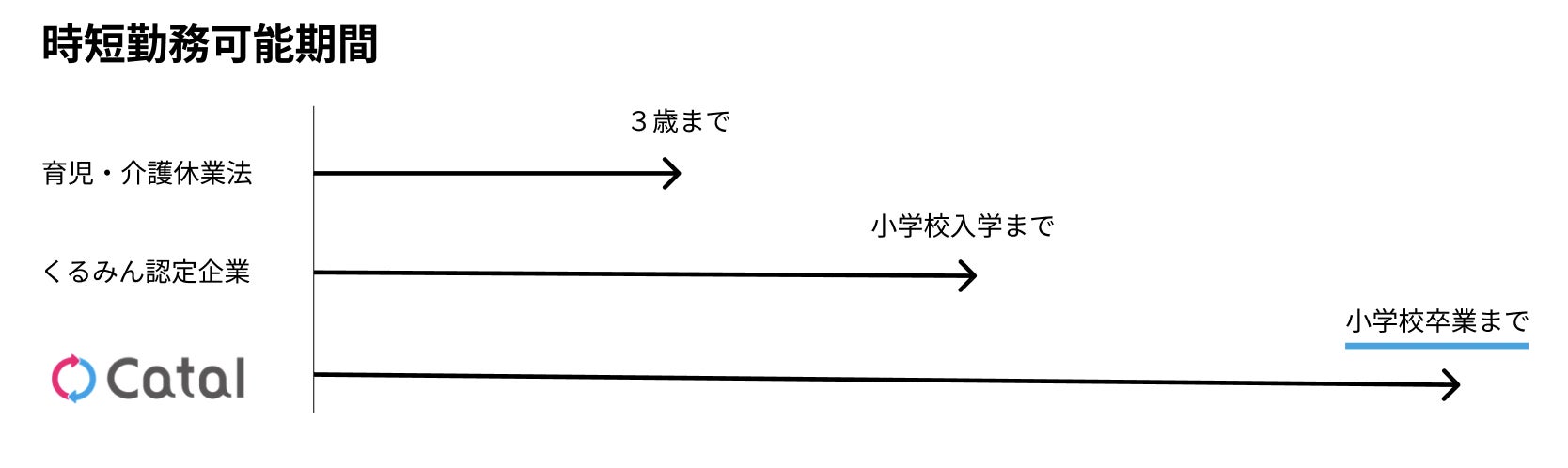 育児・介護休業法で定められた時短勤務対象者は3歳未満の子どもがいる社員。そして多くの企業では小学校3年までの子どもがいる社員を時短勤務の対象としています。しかしキャタルでは子どもが小学校を卒業するまでが時短勤務の対象としているため、子どもが小さいうちはできるだけ子どもと過ごす時間を確保したい社員から「働きやすい会社」との声が上がっています。
