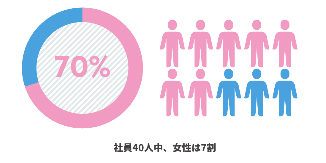 ①女性社員7割、社員平均年齢35歳