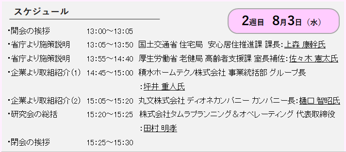 - 2週目 8月3日(金) テーマ「高齢者住宅施策の最新動向と自立支援」~ICTの活用~