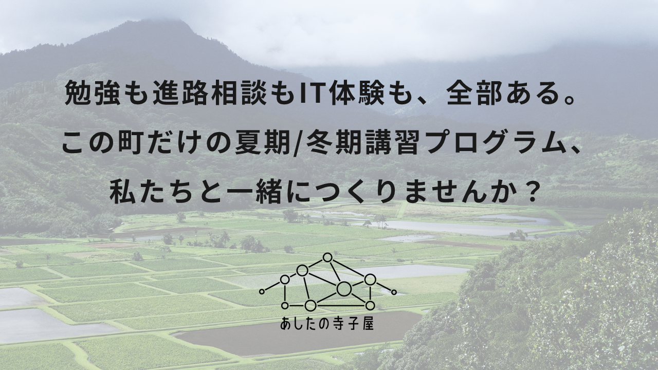 株式会社あしたの寺子屋(本社:北海道札幌市、代表取締役:嶋本勇介)は、「学習支援」・「大学生/社会人との対話」・「ワークショップ」の3つを盛り込んだ、子どもたちの世界を拡げる次世代型夏期/冬期講習を、全国に展開するパートナーを募集しています。