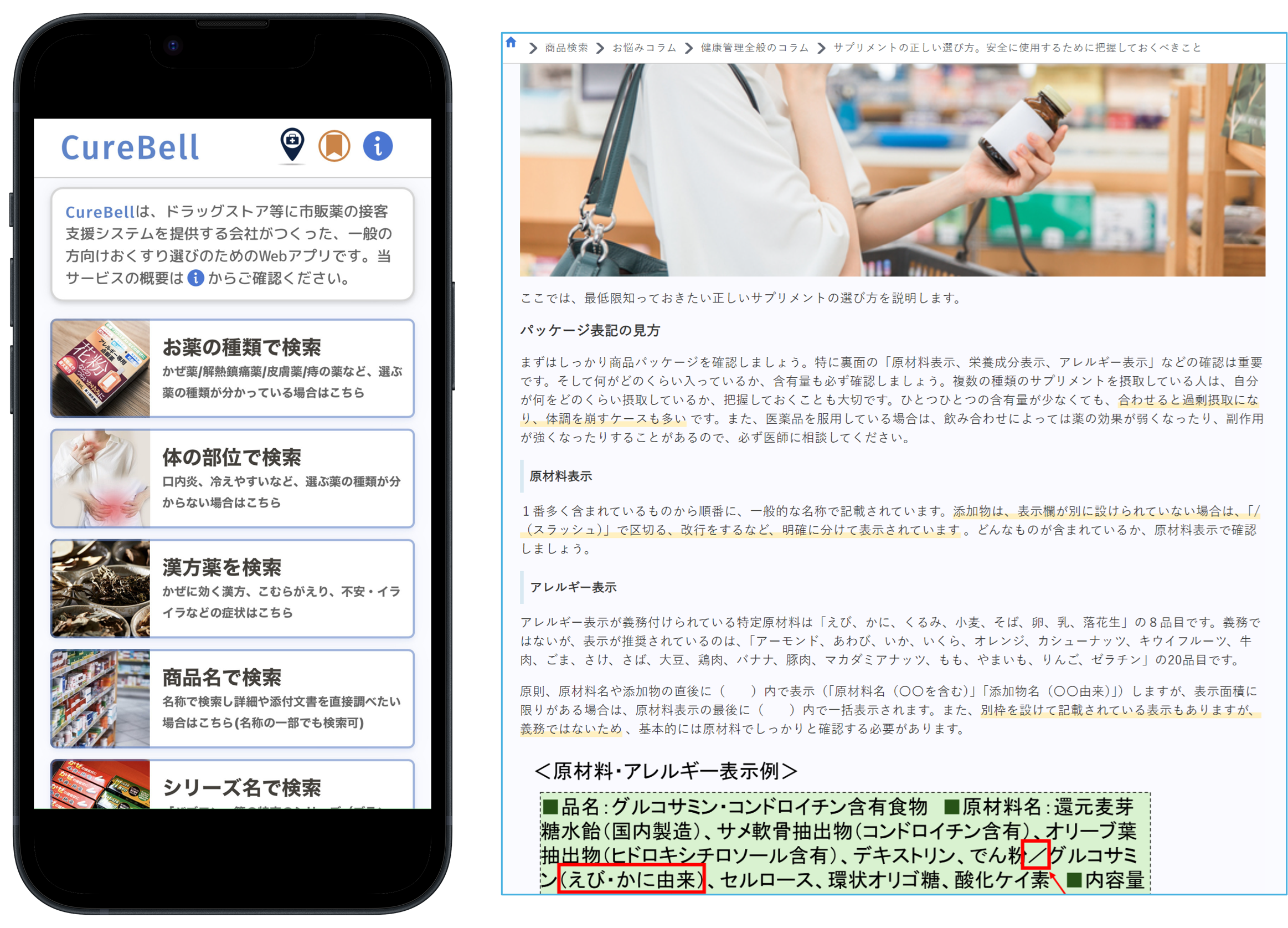 CureBell(キュアベル)は、ドラッグストア、薬局等に業務支援システムを提供する当社が、「私たちがOTC(市販薬)をもっと便利かつ安全に選べたら」との思いから昨年リリースした生活者向けの市販薬選定Webアプリです。様々な症状や嗜好等に合わせて、生活者が自らに合った市販薬を探すことができ、妊娠中の方や小児用等の市販薬も簡単に選定することができます。本年8月には、サプリメントの選定支援機能を追加する予定です。