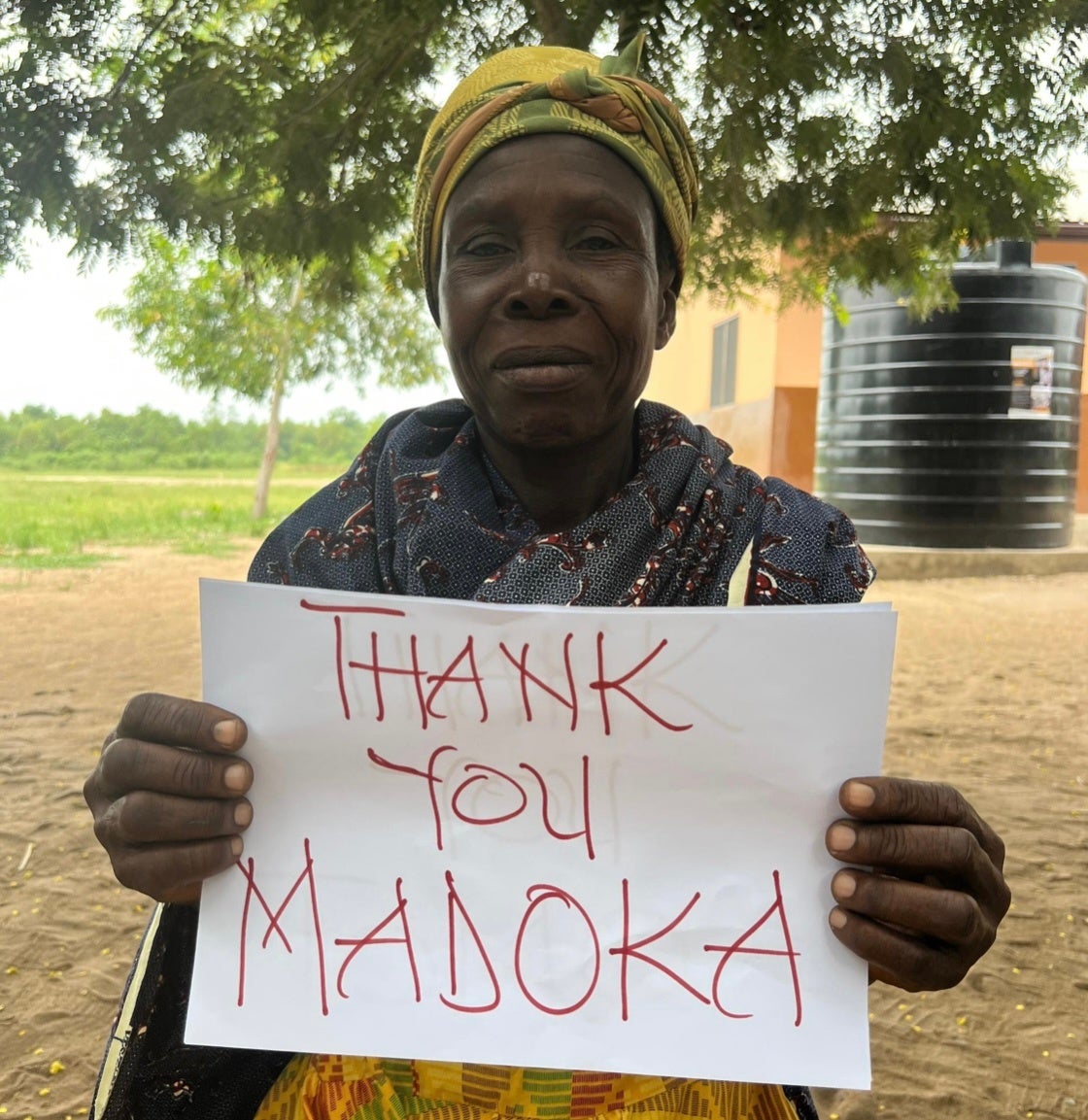 現地の女性が「THANK YOU MADOKA」と書かれた紙を持って撮影したもので、実際に寄付品が手元に届いたことの証明でもあり、支援の実感が伝わる1枚。社会的・文化的に下着が手に入りづらい地域への支援成果を示しています。