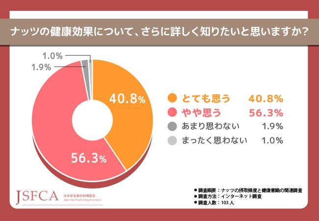 そこで今回、ナッツソムリエ資格認定試験(https://www.asc-jp.com/syokubu/nuts/)を主催する日本安全食料料理協会【JSFCA】(本社所在地:東京都港区)は、全国20〜60代の男女103名を対象に「ナッツの摂取頻度と健康意識の関連調査」を実施しました。