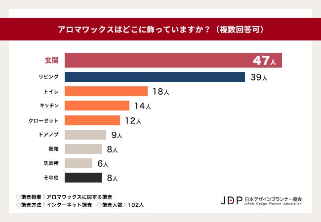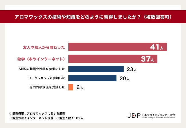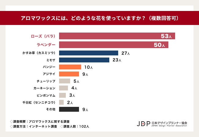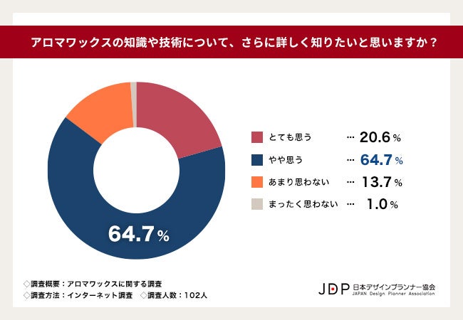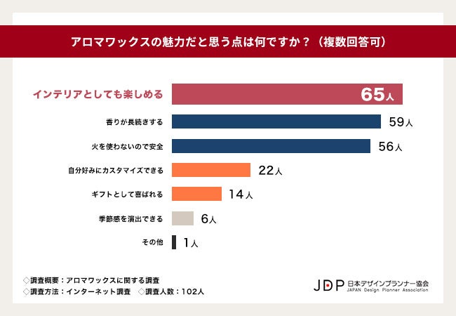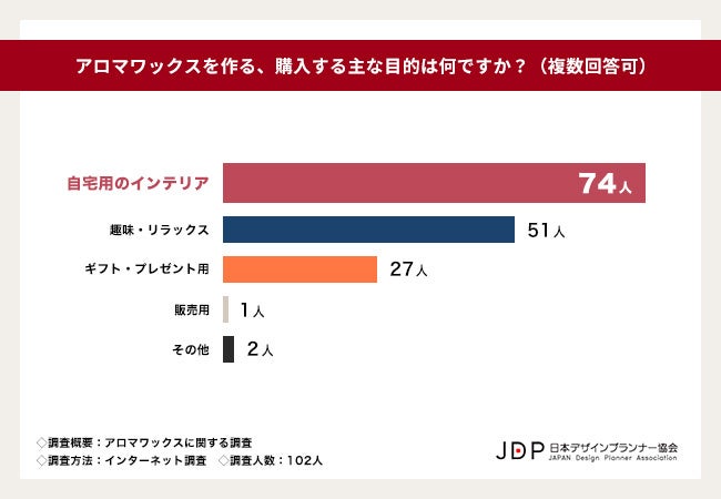 日本デザインプランナー協会【JDP】(本社所在地:東京都中央区)は、アロマワックスを手に入れたことがある全国20〜60代の男女102名を対象に「アロマワックスに関する調査」を実施しました。