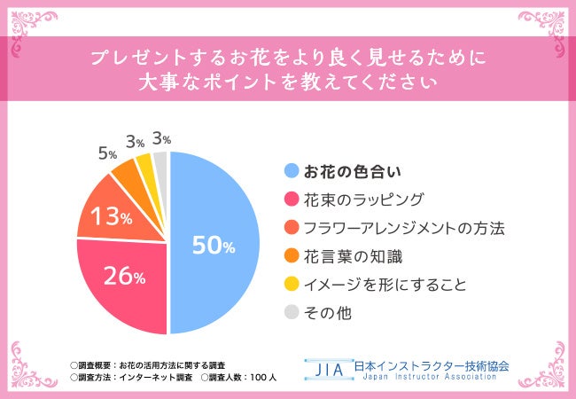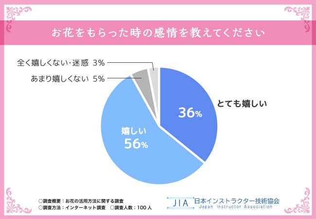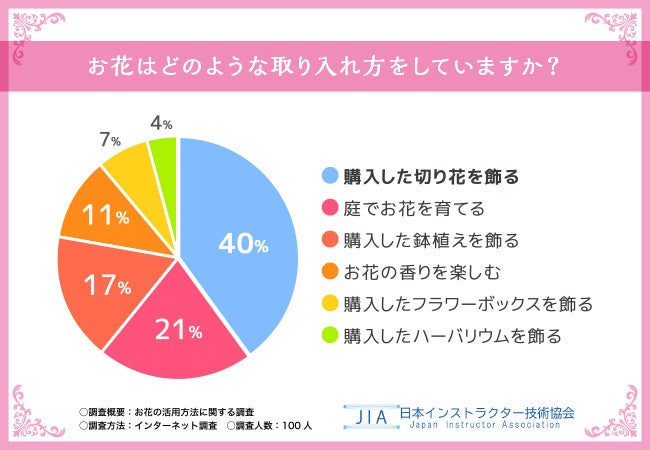 そこで今回、花屋コーディネーターの資格検定試験(https://www.jpinstructor.org/shikaku/flower/)を主催する日本インストラクター技術協会(https://www.jpinstructor.org/)は、全国の男女100名を対象に「お花の活用法」に関するアンケートを実施しました。
