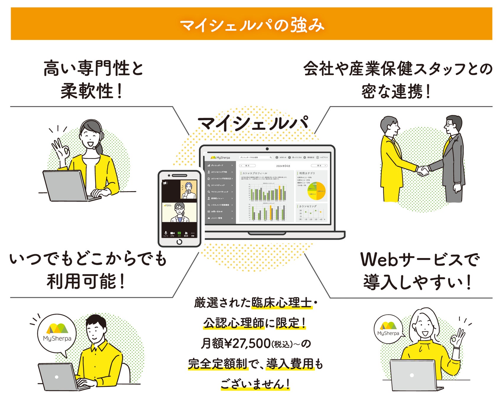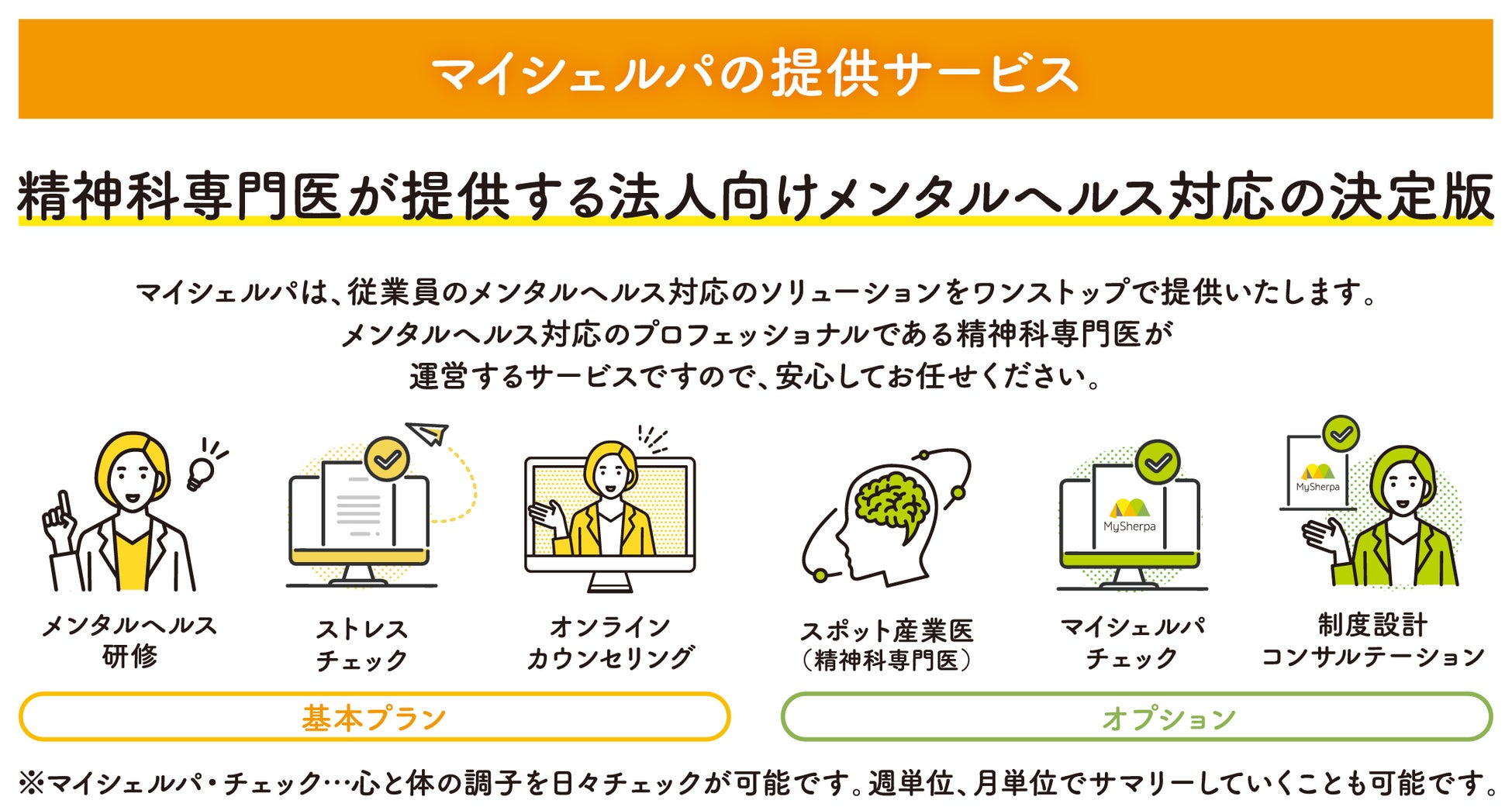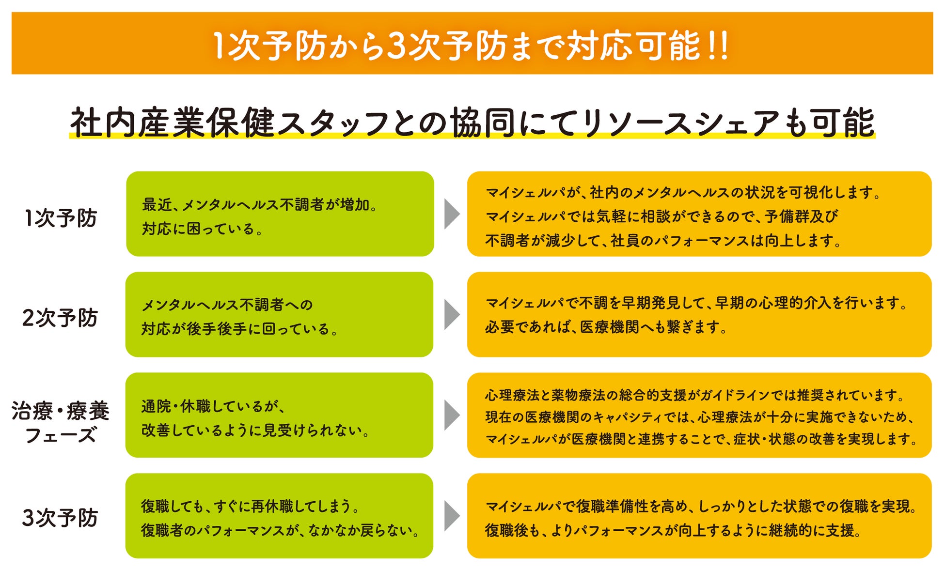 「マイシェルパ」は、メンタルヘルスの専門家のみで構成されているため、1次予防から3次予防まで対応し、契約法人様のメンタルヘルス対策を強力にサポート可能です。従業員の健康を守り、生産性向上に貢献します。