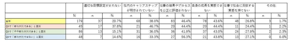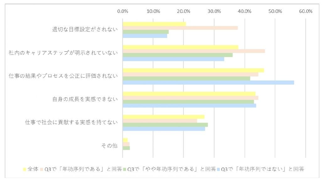 一方、Q3で「年功序列である」と回答したグループの特徴として、「やりがいを持って働ける環境が「ない」」理由として、「適切な目標設定がされない」(37.8%)、「社内のキャリアステップが明示されていない」(46.7%)を挙げる割合が、他グループに比べ著しく高く、「年功序列である」グループ特有の問題が明らかになった。